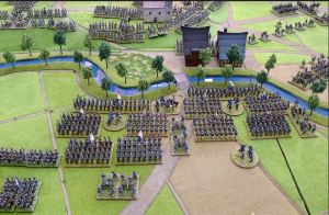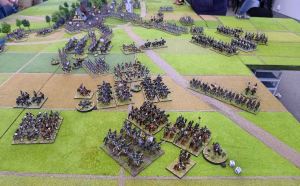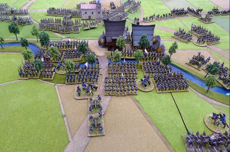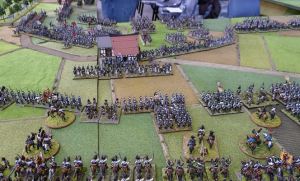 French high water. They have taken the village but Morand’s division has broken, Grouchy still won’t move and is now taking artillery and musketry fire, John has arrived on the table edge and is preparing to roll down the now open flank.