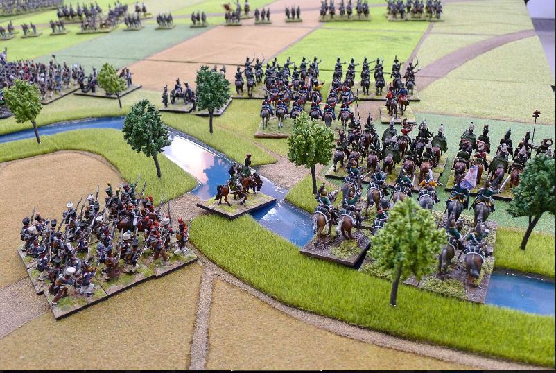 Grouchys Dragoons moving to attack Nordmans flank. Montvrun behind has sustained casualties, Morand can be seen advancing in centre. Note the darkened patch to the front of the Dragoons….a present from a stupid 40k gamer who leaned over table holding a coffee…and spilt it. We should be thankful the neanderthal missed figures.