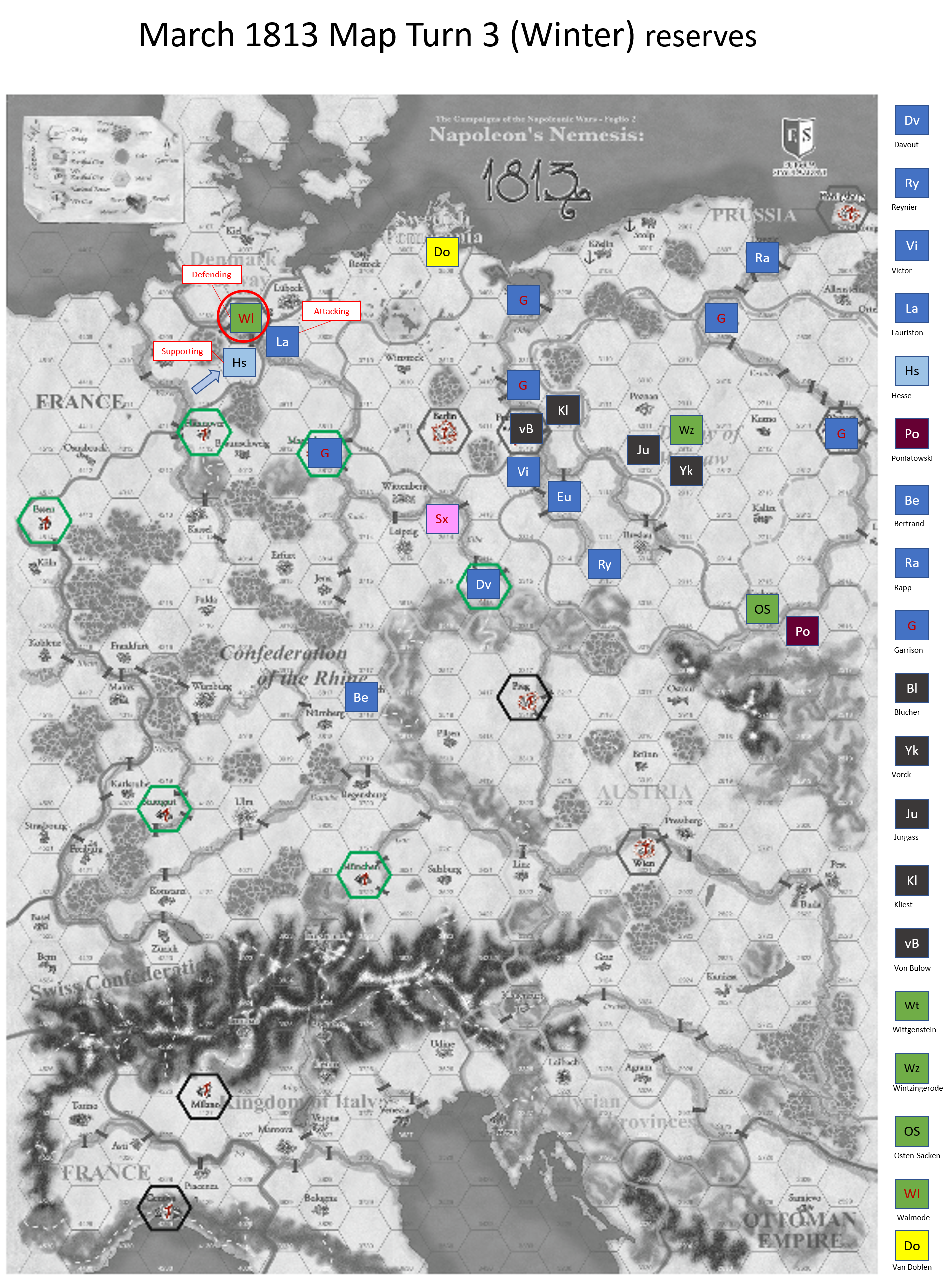 But result of move is Davout moved up to support Reynier and attack Yorke south west of Breslau. Yorke got the jump and attacked Davout, some poor dice rolling from Alan meant that Reynier decided not to support Davout when he got attacked. A good result for the Prussians. So on June 3rd we will fight the resulting combat, the Prussians are outnumbered still, but should be a close contest.