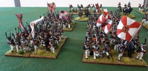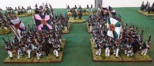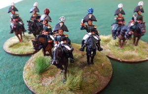 First 4 squadrons still on paint table. Almost ready to base then straight onto 2nd group. For the keen eyed experts on all things Russian…these are actually the Marioupol Hussars. Much better colour than the brown/ yellow of Achtyrka Hussars. And yes…that is a regiment of the Vistula legion tucked in behind them…they must have got lost.