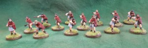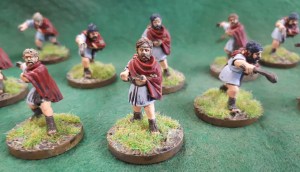 Close up of unit, there are 5 differing poses which makes for a nice mix. Went with a sky grey tunic, scarlett cloak highlighted blood red and dwarf flesh with just an ink and re highlight. 4 or 5 hair colours and leather slings/sandles. Bronze clasp on cloak and thats about it. Nice, simple colours and relaxing to paint.