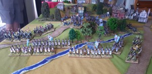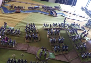 Allied centre with Prussian Guard, Russian Grenadiers, Prussian guns and Russian Dragoons…. French on other side of the river.