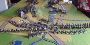 In Allied centre batteries engage French guns over river while guard jager skirmish in front of brigade of guard.