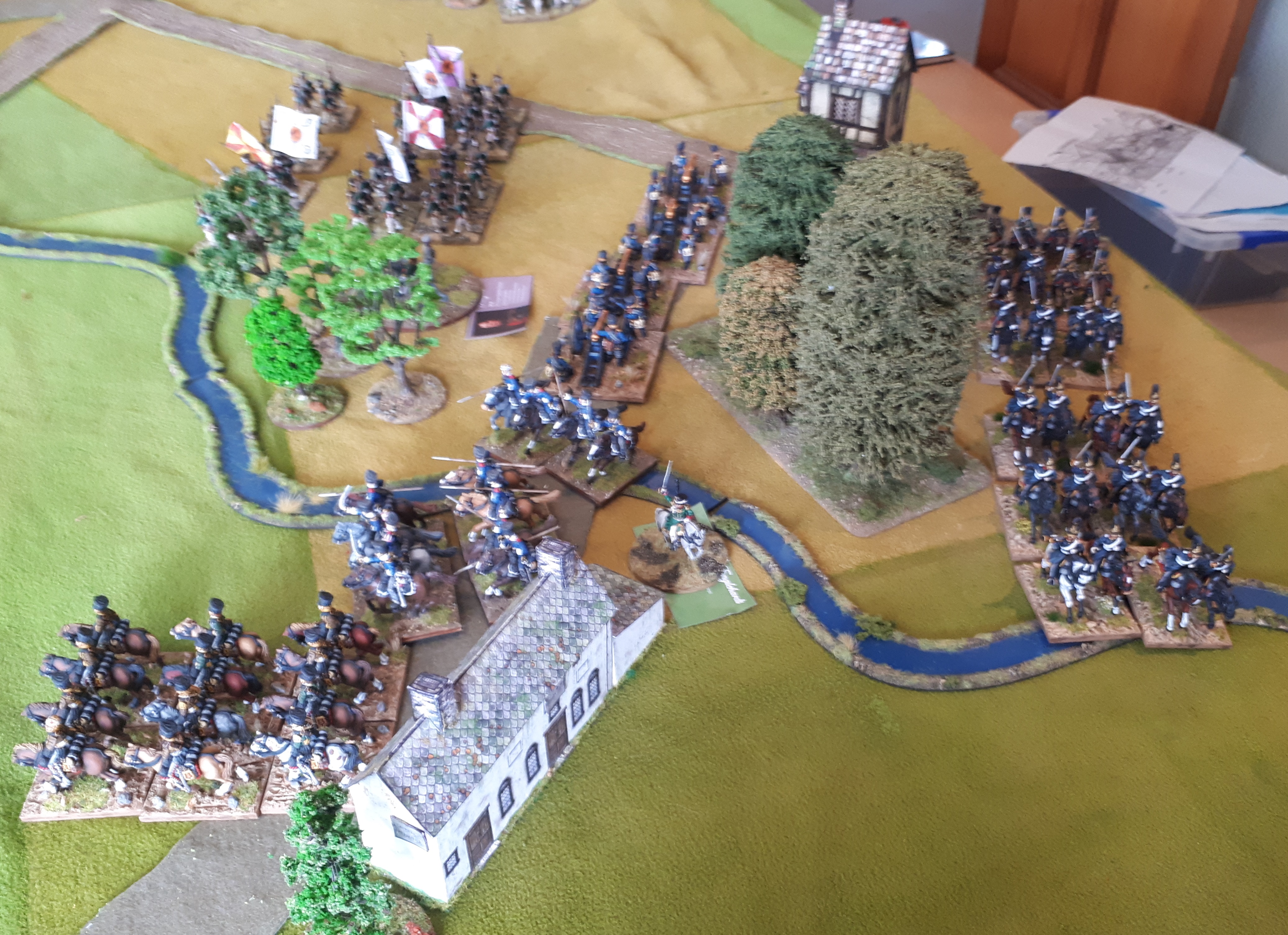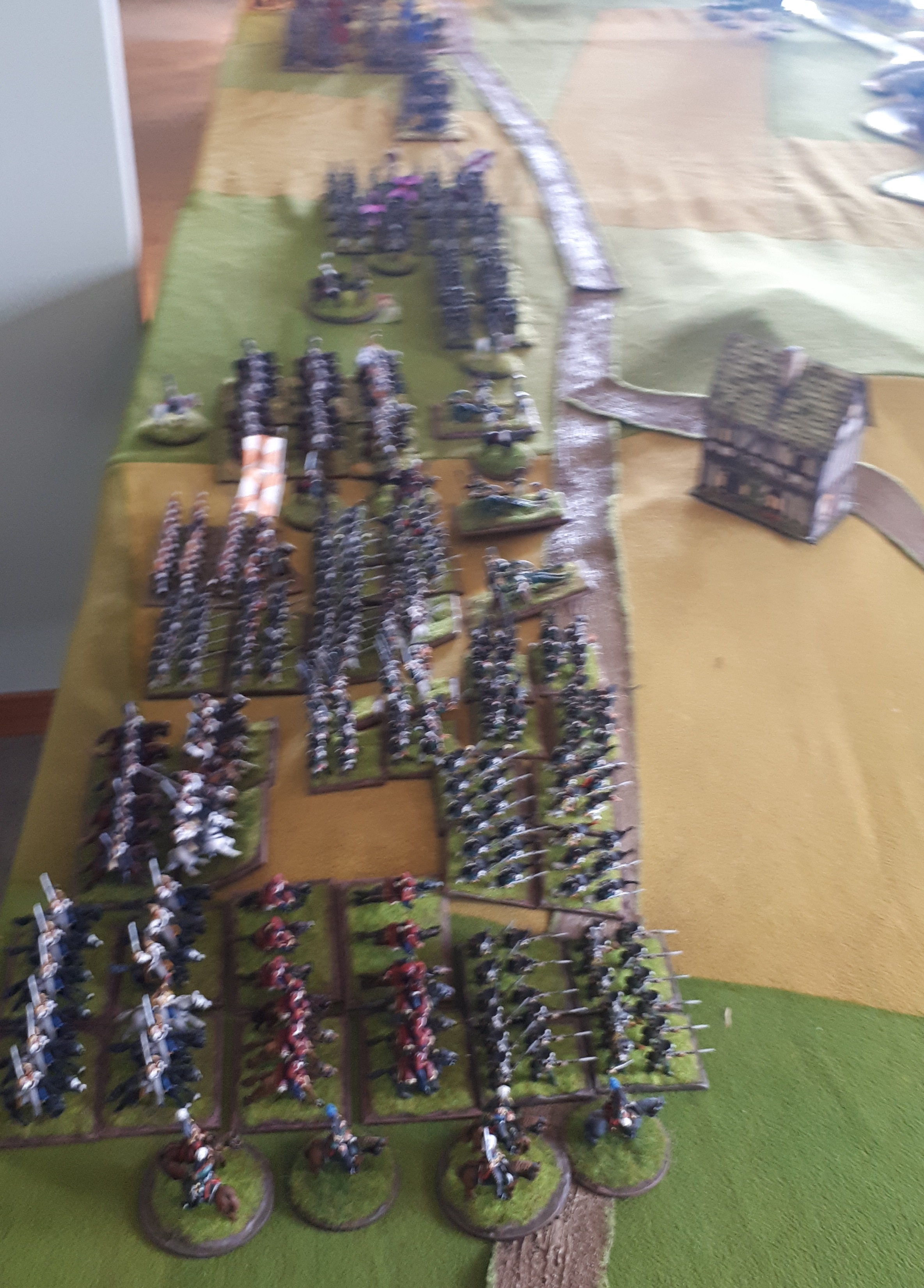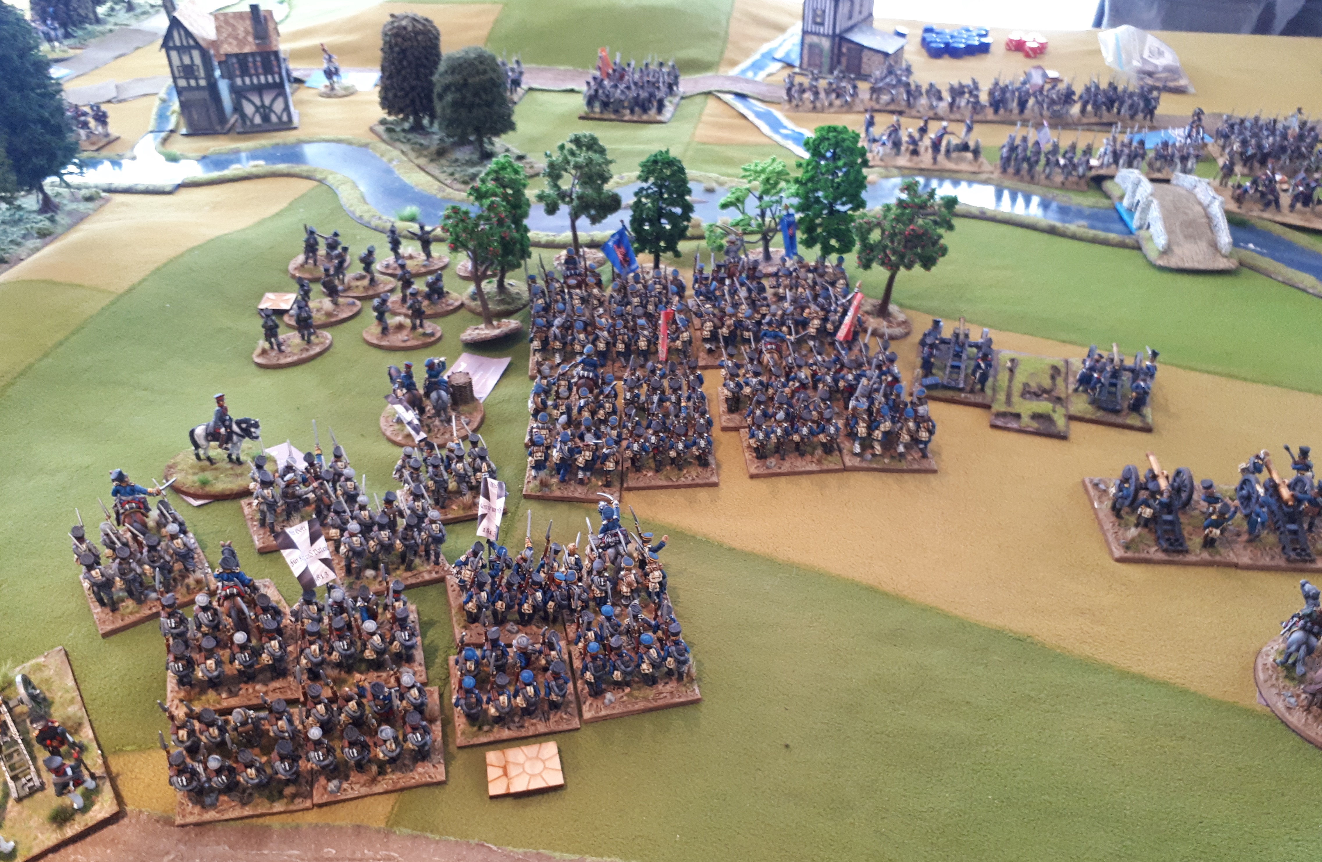 Allied centre with Prussian Guard, Russian Grenadiers, Prussian guns and Russian Dragoons…. French on other side of the river.