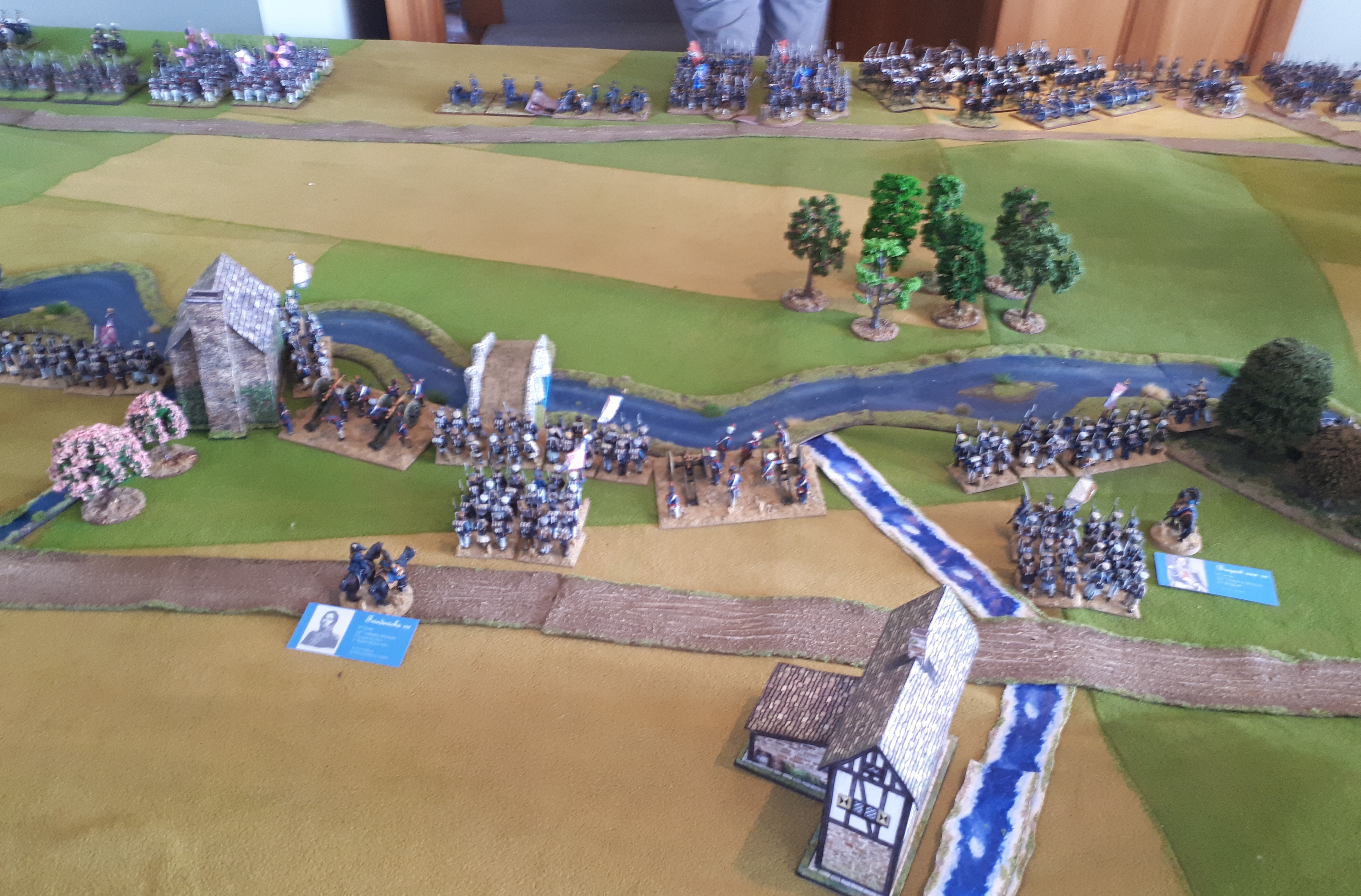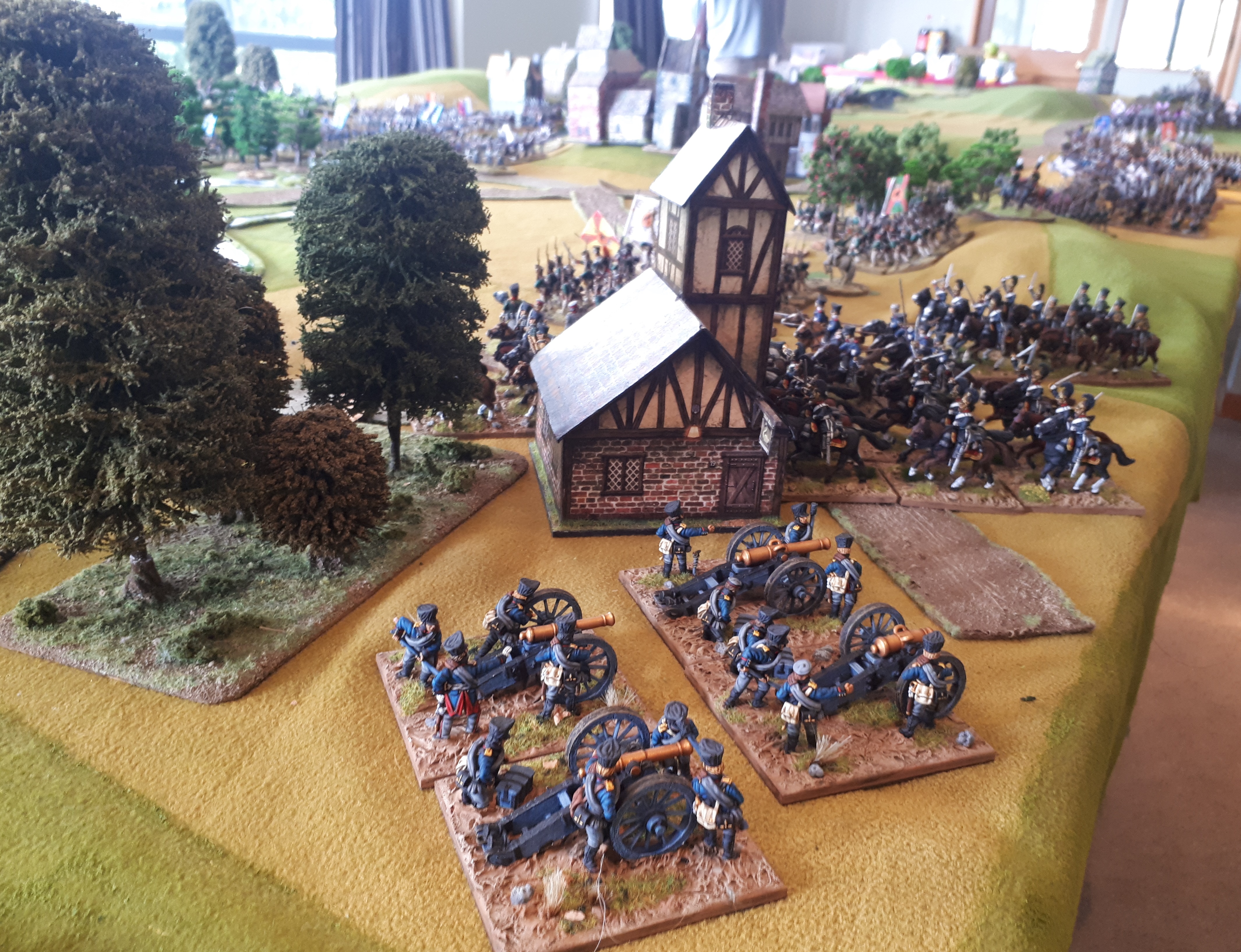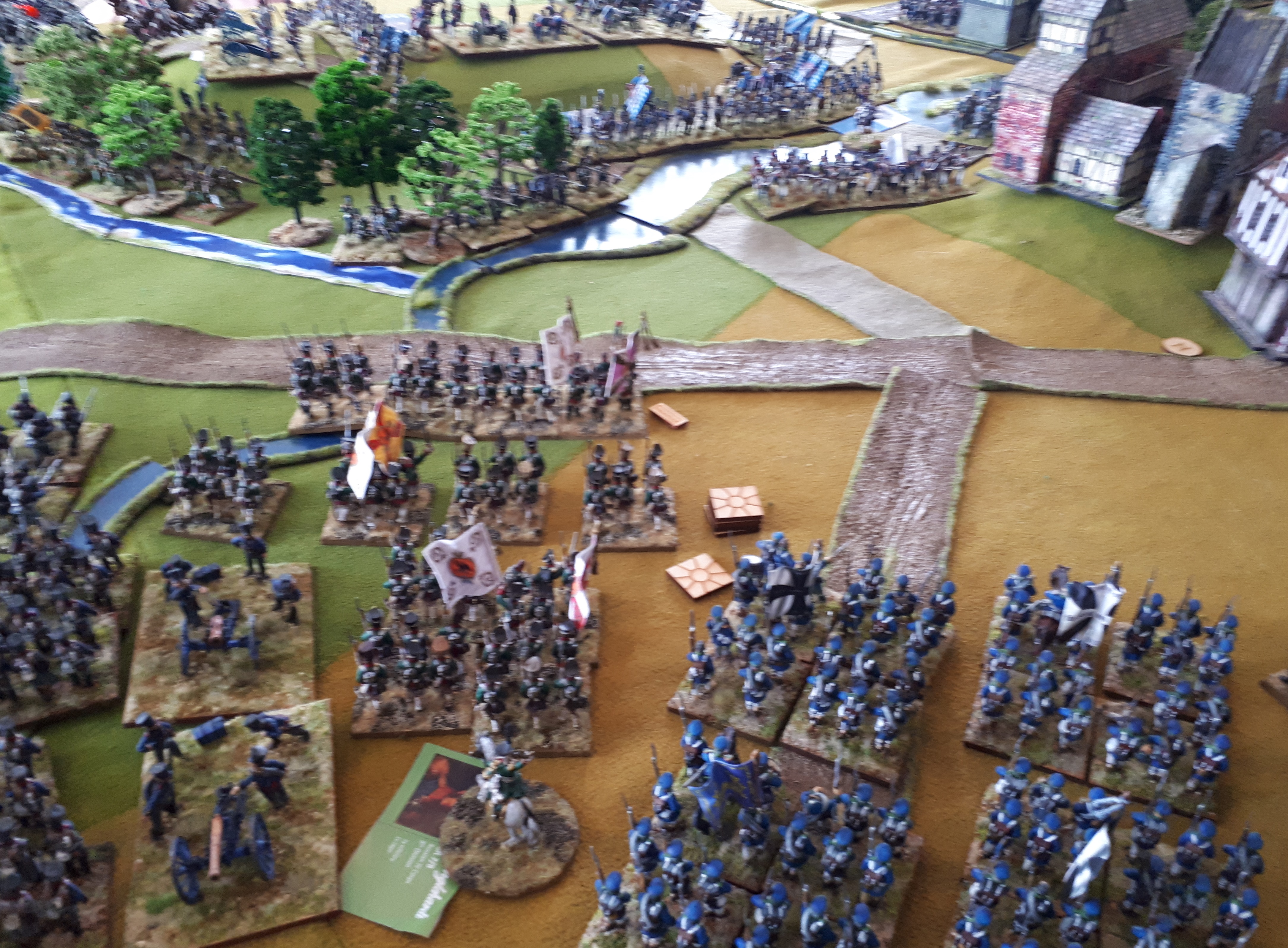 Allied centre with Prussian Guard, Russian Grenadiers, Prussian guns and Russian Dragoons…. French on other side of the river.