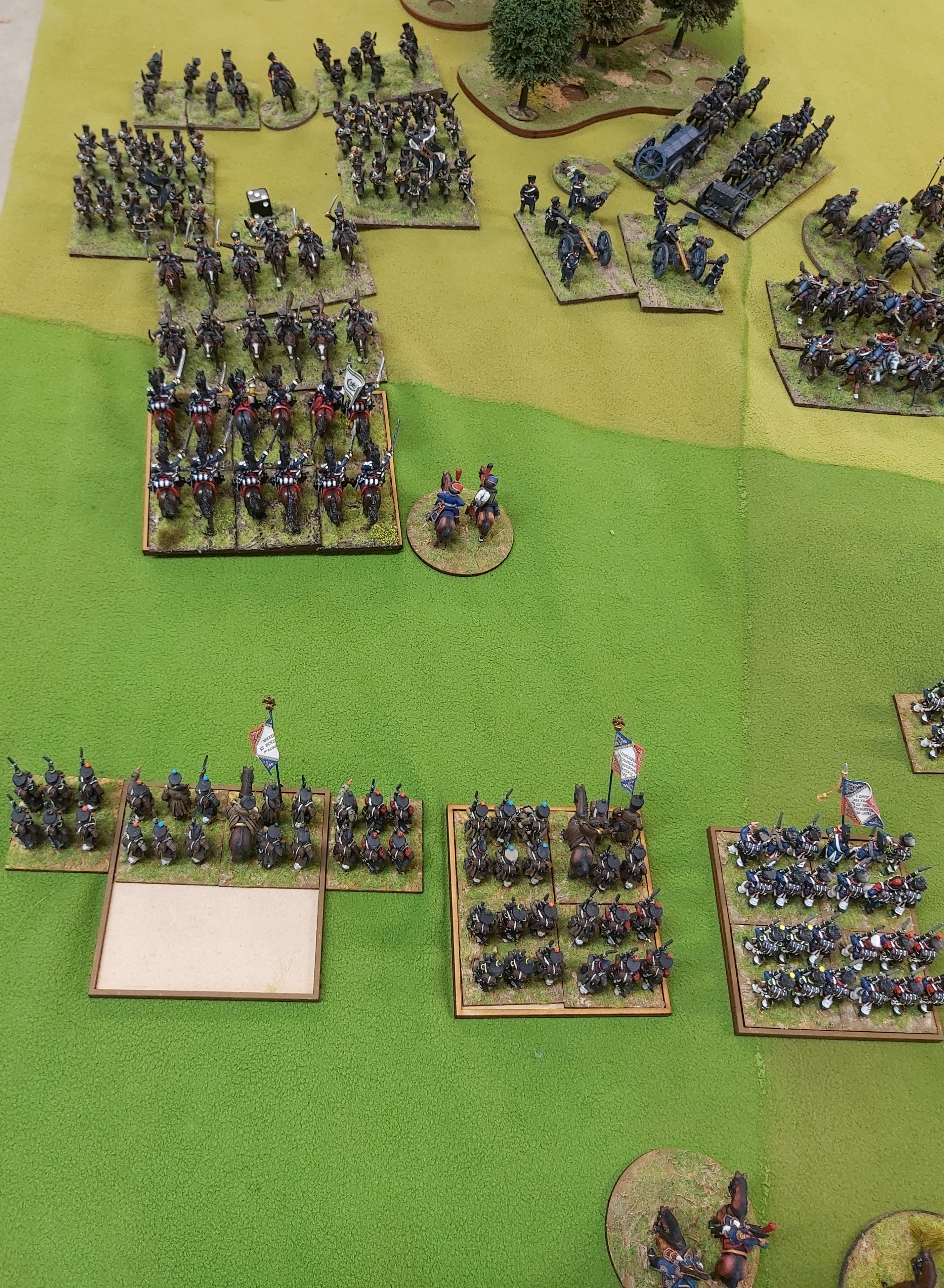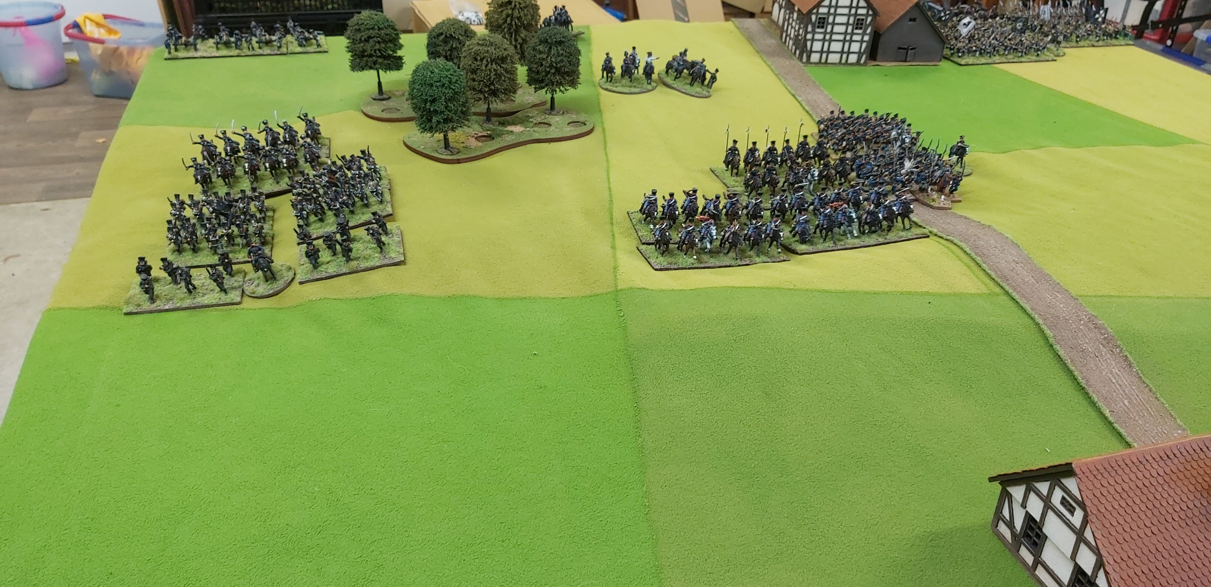 I won first turn. Both infantry brigades made x3 moves down table, Uhlans 1 move down my right flank, on the left the Wurtts stood around.