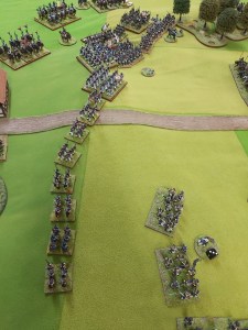 Now on my left flank I had deployed a skirmish cloud out in front of my columns. Goldie charged this with his Leib Hussars…my skirmishers naturally retired on their columns leaving the Leib hussars in the open. So I deployed into line…and gave them a good round of French gunsmoking!