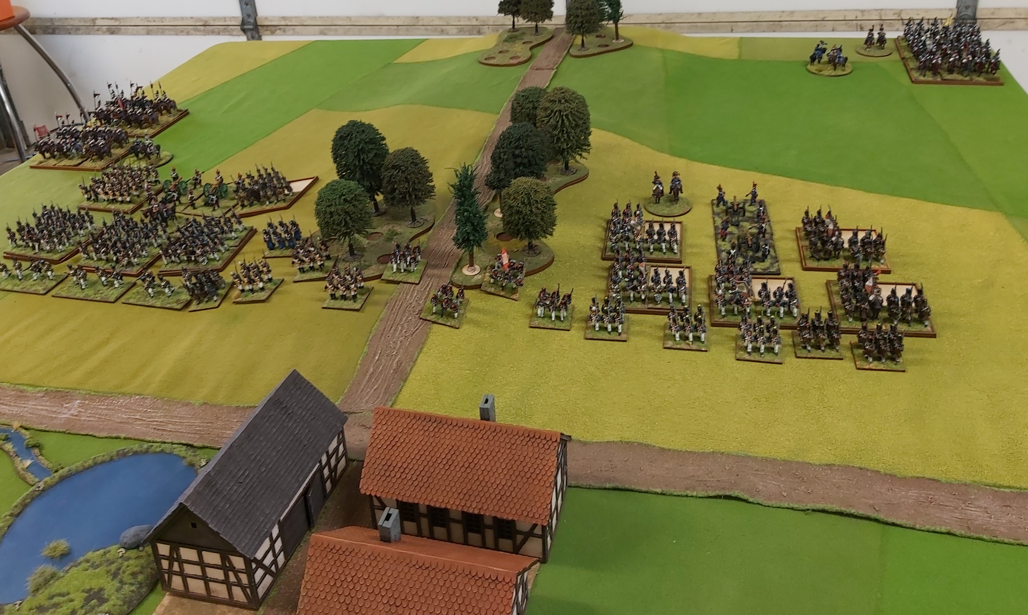 We decided to play down the battlefield which was 10ft x 6ft. We used Goldies new 1813 building and my new woods(not quite finished but close enough).