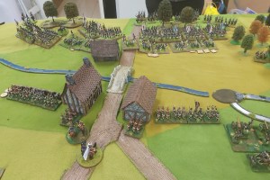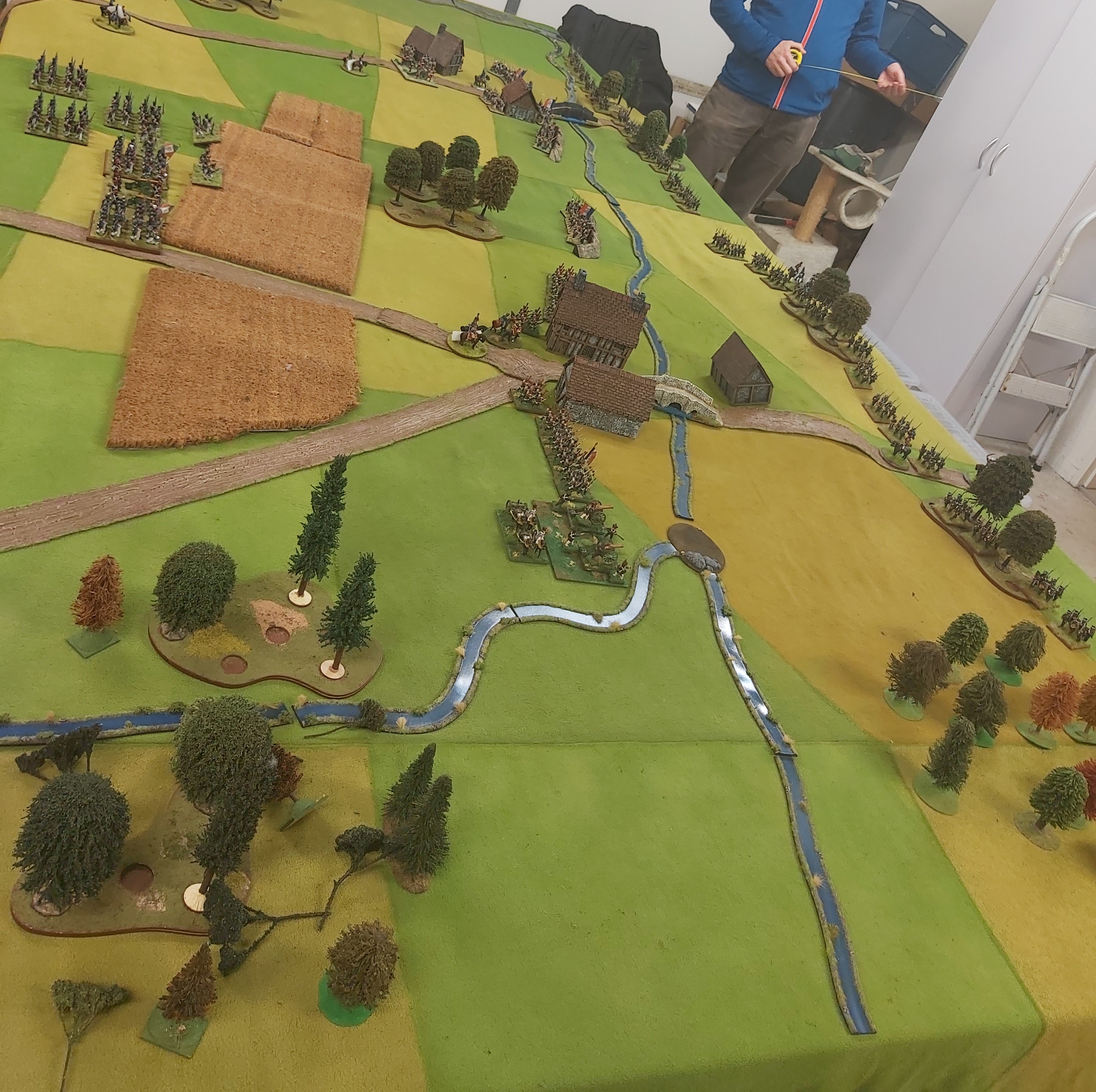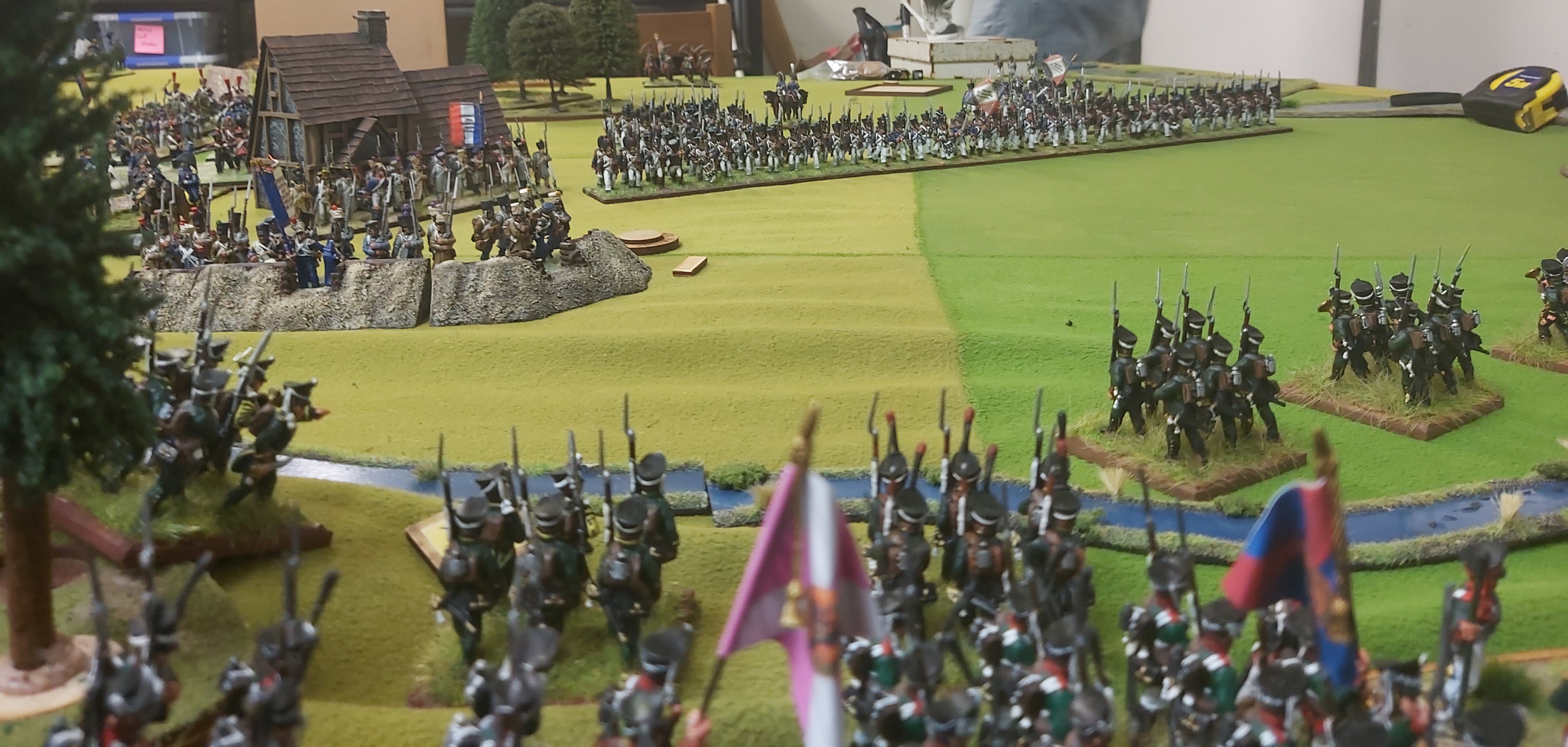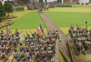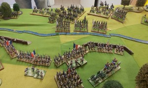 And that was game called….will have to play on a weekend to get to a conclusion. French won this one in a canter, no villages swapped sides. No one used the abilities I gave the commanders…..will take a piece wood to next briefing so the French understand to use their commanders and the Russians understand they are meant to take the villages. Will need change setup as Russians need more depth so their guns do not set up within musket range of villages.