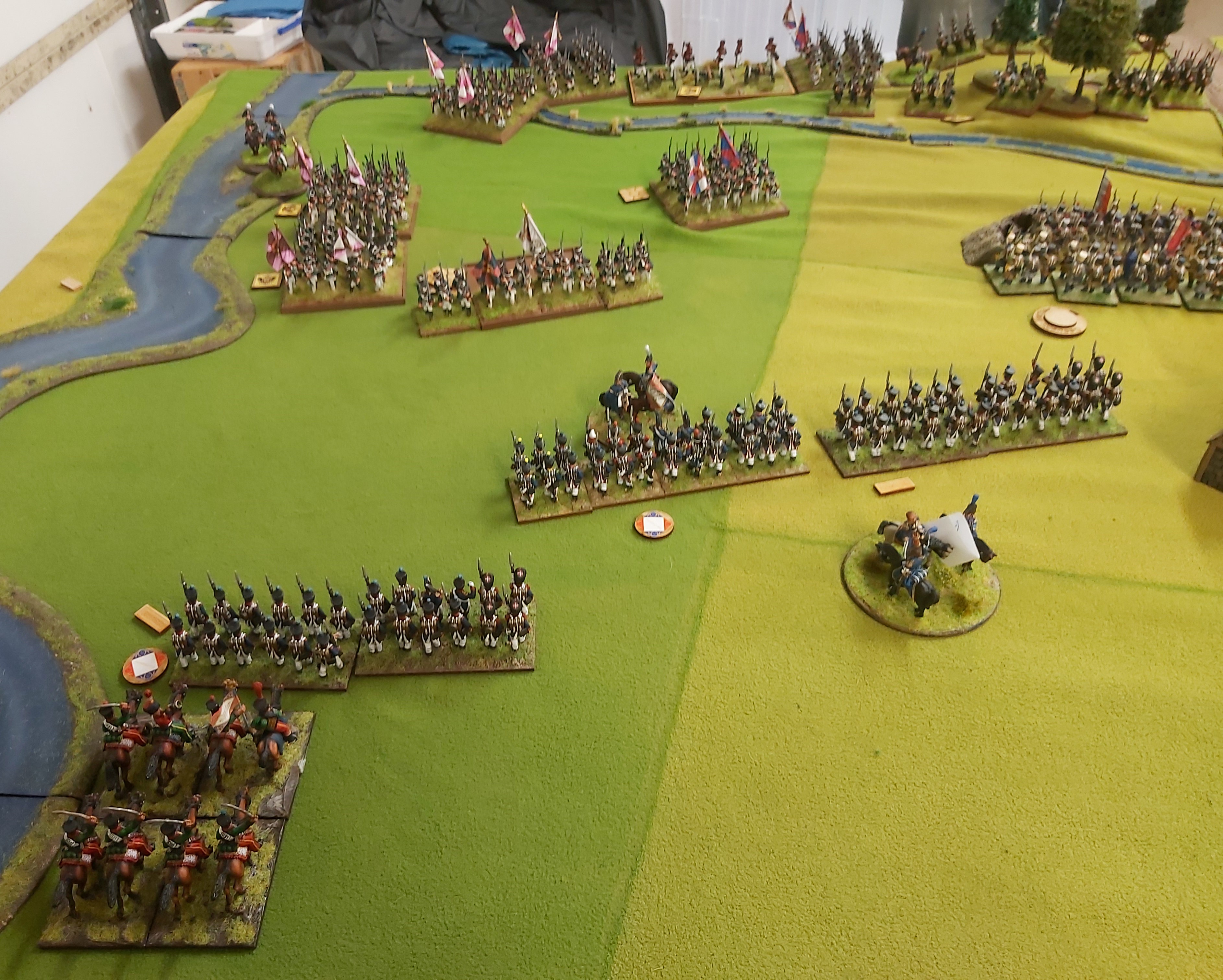 The Russians have 2 standard divisions of 4 Jager and 8 Musketeer bttns each plus 2 light and 1 position battery each. The Jager start on table with the musketeer brigades/ artillery advancing on. They also have 2 brigades of 2 Dragoons each to arrive later on.