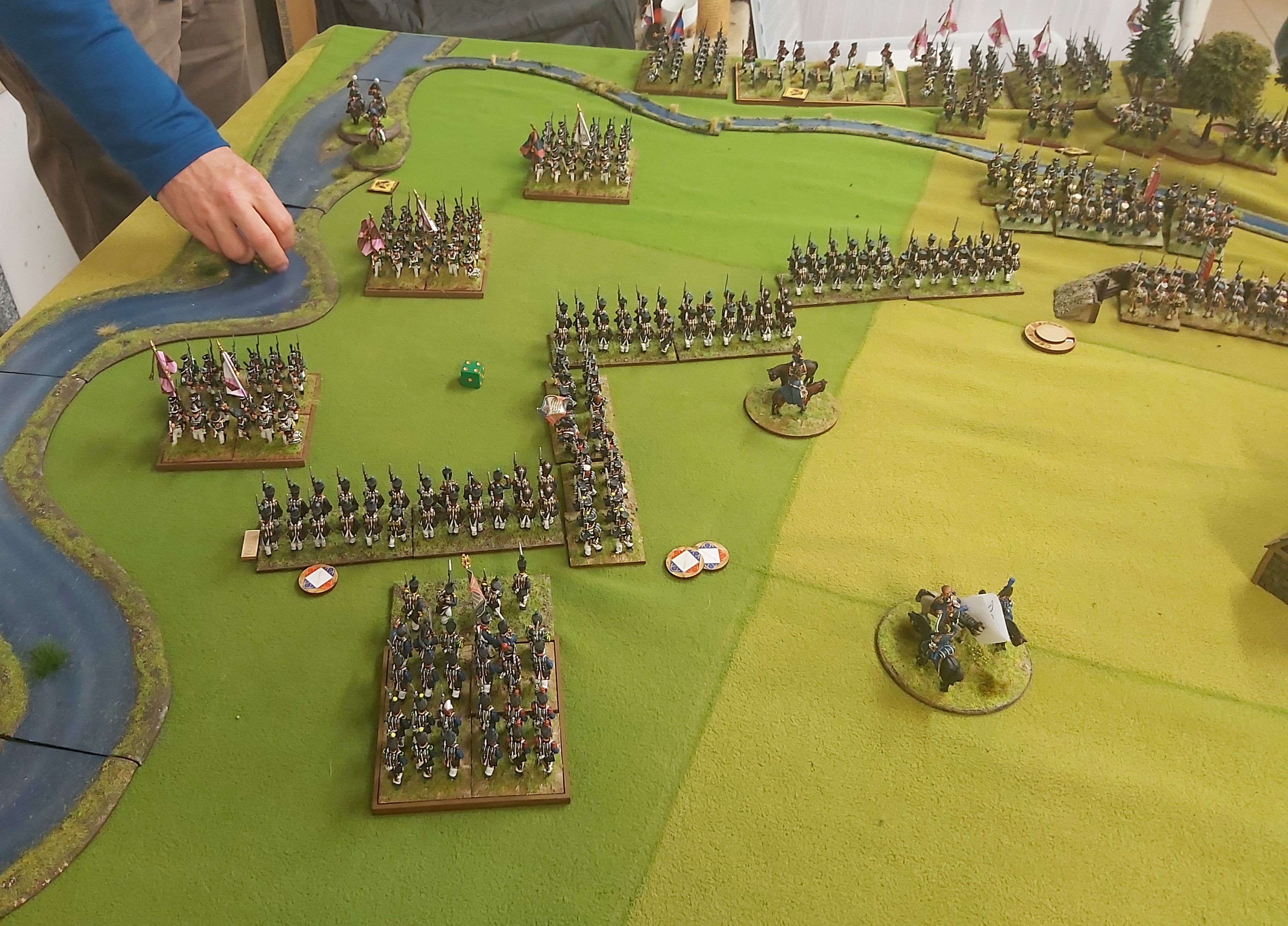 Goldies French after several rounds of combat…PW charged in…French held….then flank attack…Russians pop(where green dice is). Others stay.