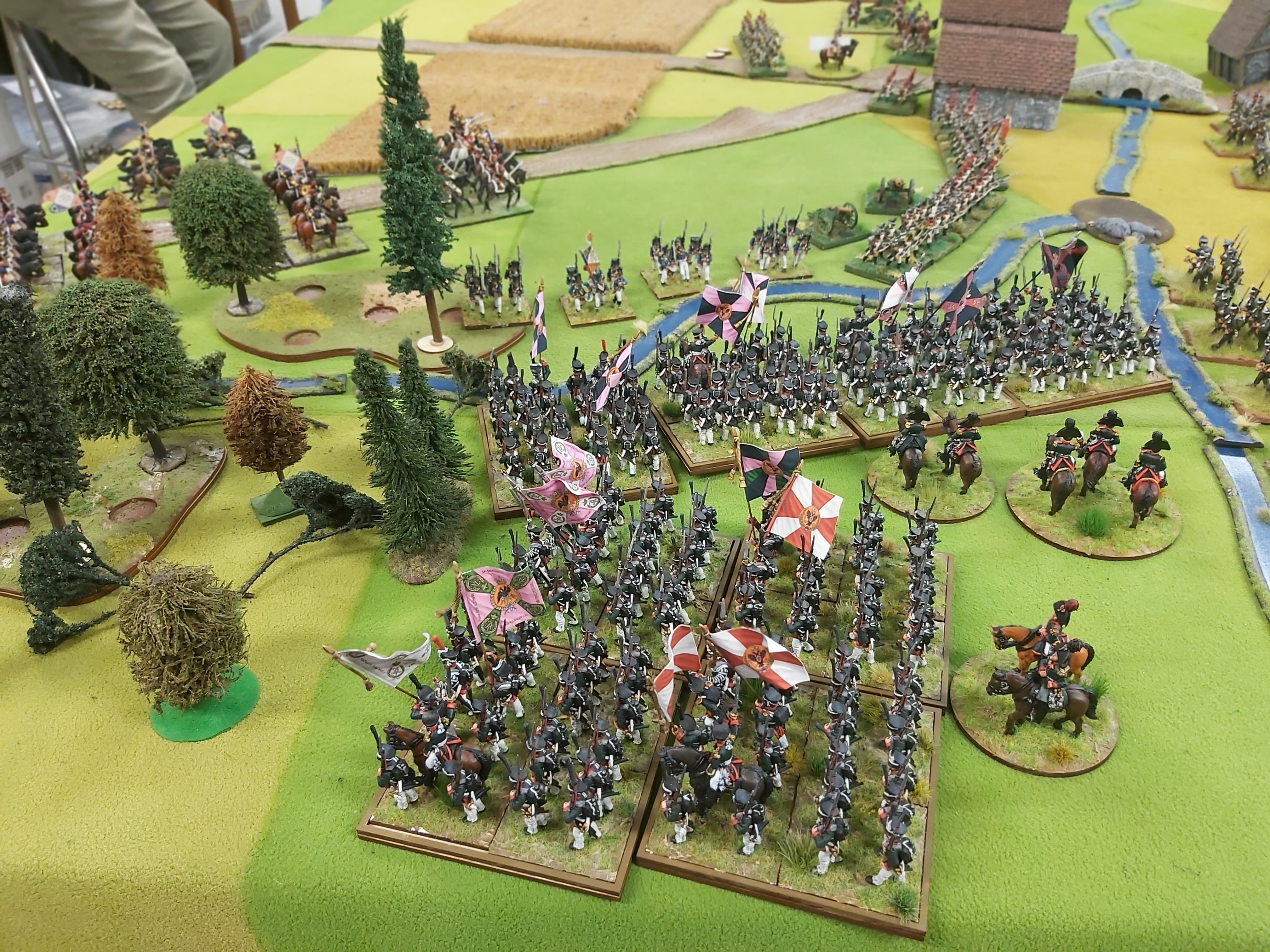 Something not in the CoE scenario but one found in another. Russian 2nd Grenadier Division, which is my actual division arrive on a flank march…..as Goldie has sent the reserve brigade to other flank…the French had the Cuirassiers there…..so on a flank with woods and wheat fields…..perfect…for me anyway…..plan was to send briagde into woods…..shoot up cavalry til retired….and set up guns behind columns and retire some columns and shoot the c**p out of the cavalry…..alas ran out of time. Will need refight this on a weekend.