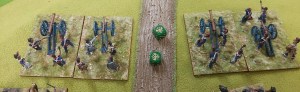 French turn 1, one bttn has been destroyed, second has retired from central bridge(its a destroyed bridge) with 3 wounds and a disorder. The 2nd line bttns now move up to cover bridges.