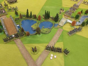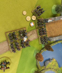 In the centre a Bavarian bttn moved up to the river bank and fired, rolling 3 6’s and inflicting 3 wounds. The bttn that had crossed the river upstream now moved up and fired along with the light infantry, adding 4 more wounds, which with the disorder meant Paul was rolling a break test on a -8. So he couldn’t pass, but then he rolled a double 1 anyway.