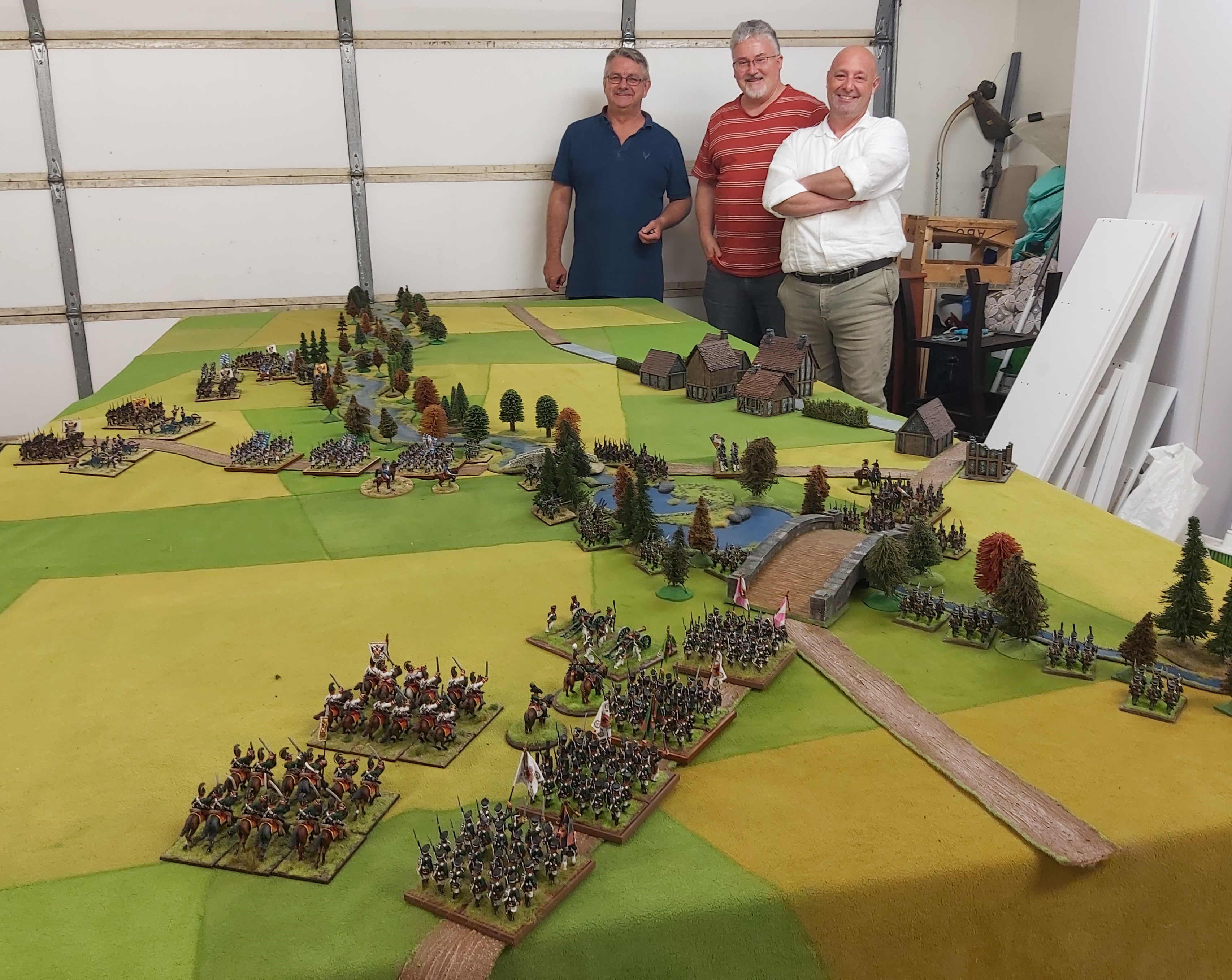 Steve is in the blue shirt, Alan (provided the Bavarians) in the red and Goldie who although Campaign umpire played the French is in the white. Below is the start positions. French on western side of the Seine. They have blown the bridge on the central road, however bridge on northern road is not blown. They have 2 bttns covering the 2 roads and 2 supporting. Allies can try and send one bttn across per turn in boats. It is 3 moves to cross. The northern bridge can only be crossed in column of march.