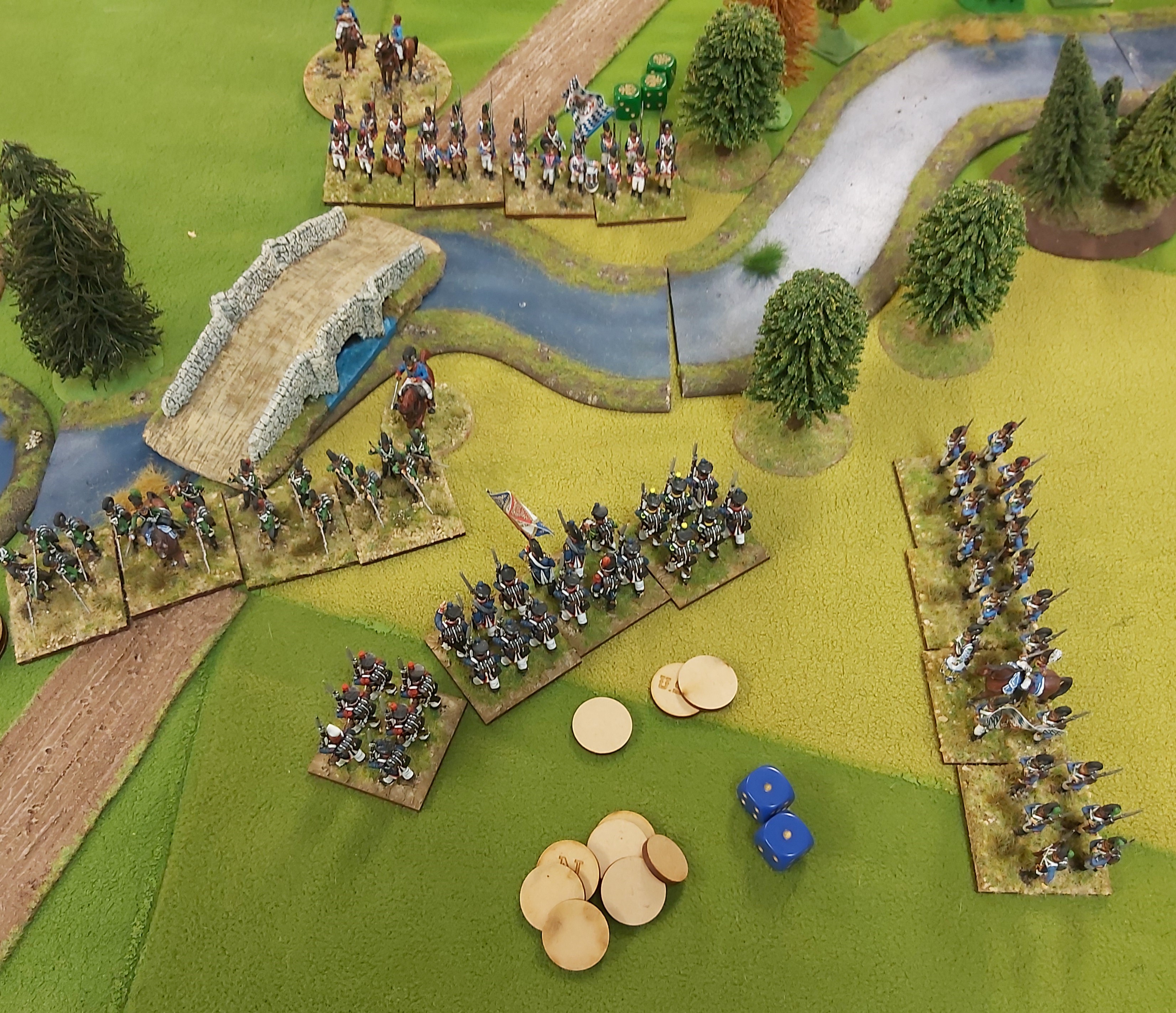 In the centre a Bavarian bttn moved up to the river bank and fired, rolling 3 6’s and inflicting 3 wounds. The bttn that had crossed the river upstream now moved up and fired along with the light infantry, adding 4 more wounds, which with the disorder meant Paul was rolling a break test on a -8. So he couldn’t pass, but then he rolled a double 1 anyway.