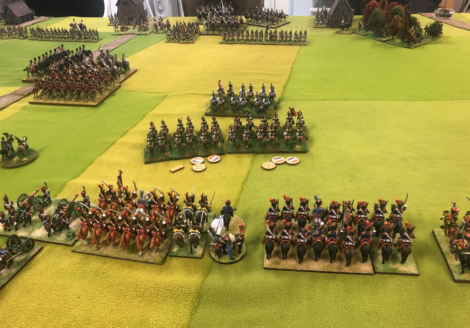 Miraculous Chasseurs a Cheval of the Guard counter charge supported, follow me!, Russian cuirassiers, suffer 3 casualties, inflict 6 casualties. The cuirassiers pass their -3 break test (merde!) but general (insert name here) dies!