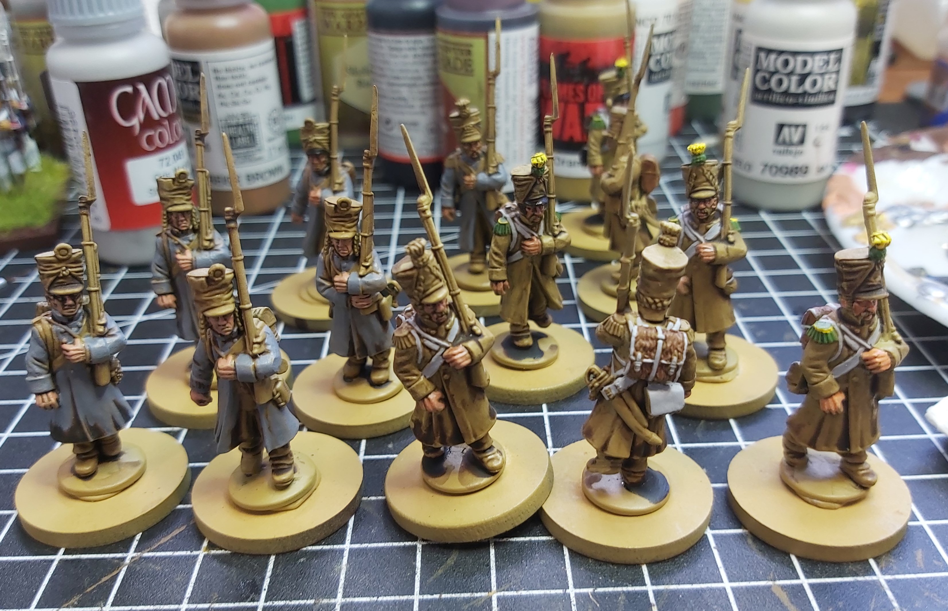 So below I have added a picture of unit currently painting. They are Warlord Games Late War Legere where I have changed to a tan undercoat, then a wash rather then my normal black undercoat style. My eyes were getting too tired so decided to give a lighter colour undercoat a go. Once I have blocked in colours then using some Army Painter Soft Tones and washes I purchased. Early days but seems less tiring to paint and a different style of look….see how I go. Was planning to get more boxes of them but Warlord Games just slapped a 25 pound postage charge on all purchased, we were 50 pounds and post free. Global Supply chains and Brexit apparently, but will have to look to local online store for ad hoc purchases going forward.