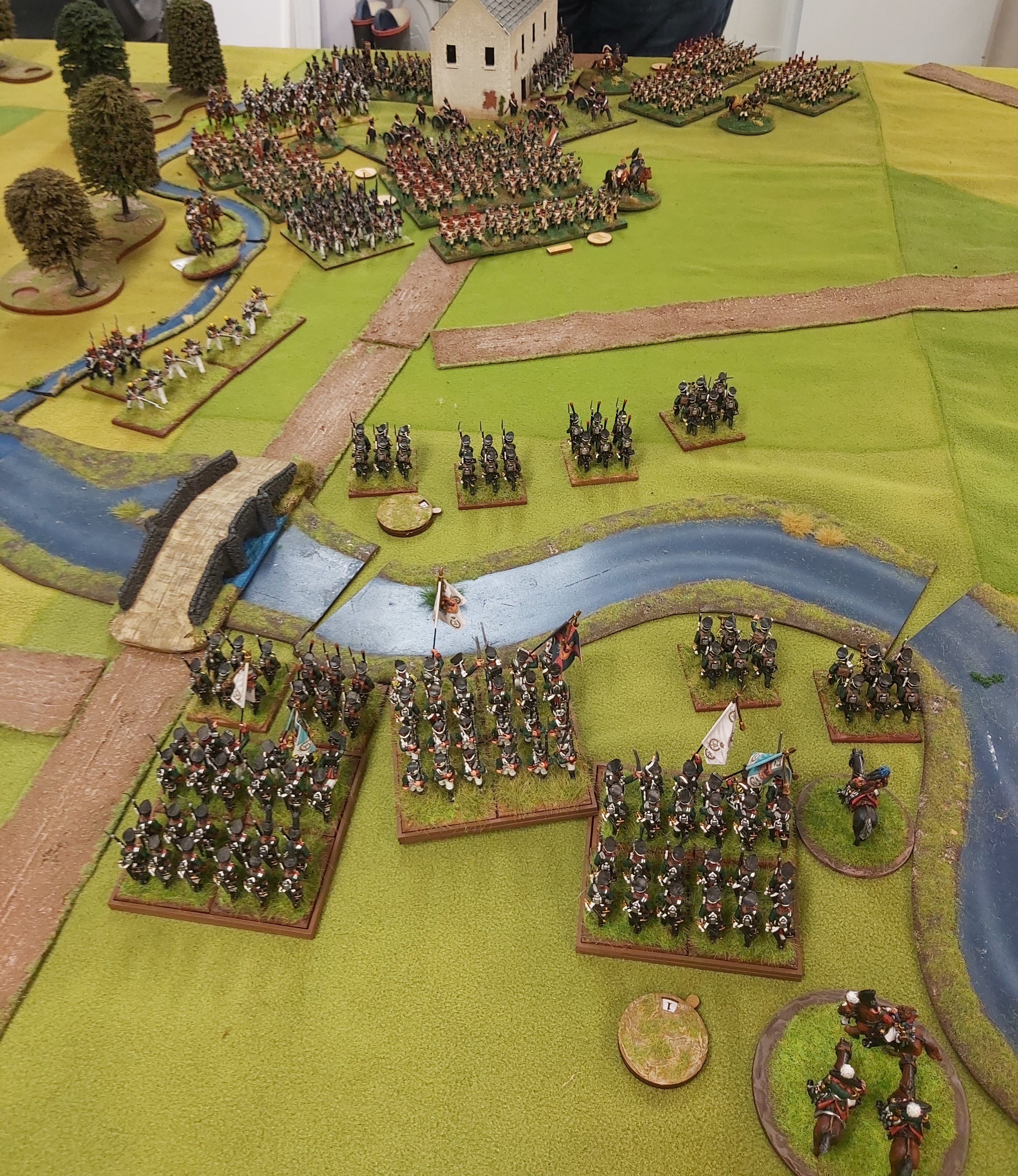 View from French side in centre at end of game. Some French have charged over river, got beaten in combat, stood then pushed Russians back. But it is days end and the French manage to escape to Coulomieres and Wittgenstein retires on Brie.