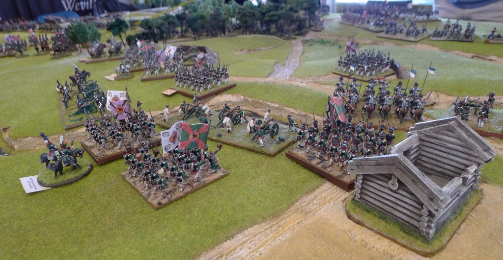 Russians around the Fleches….apparently on turn one…before the French gunline was established ..some batteries were still limbered…..Duka sent some Cuirassiers cascading across the table to take them out…how cool…..if anyone has a photo…send it to me please!