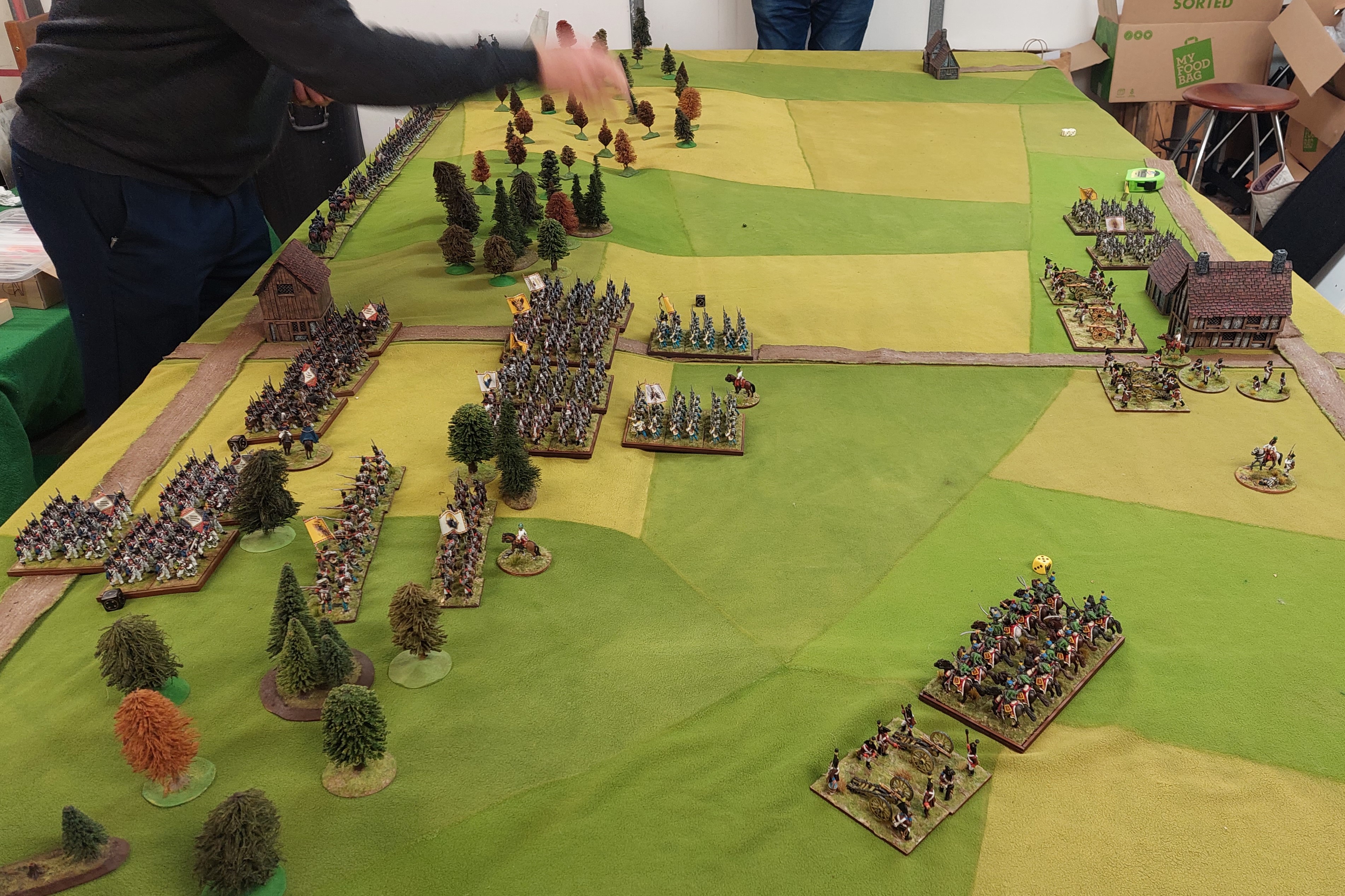 So Goldie has now taken the field with his French troops that were marching down the road. They can be seen moving through the woods. StevenT is opposite him with 5 large bttn’s of Austrians. There were 3 batteries posted in front of the Hausen which StevenT has moved and placed in what looks a dangerous position. Roberts French can be seen moving to link up in the centre. StephenC’s French have stated to advance as well. Alan has moved his horse artillery and Hussars up on the flank.
