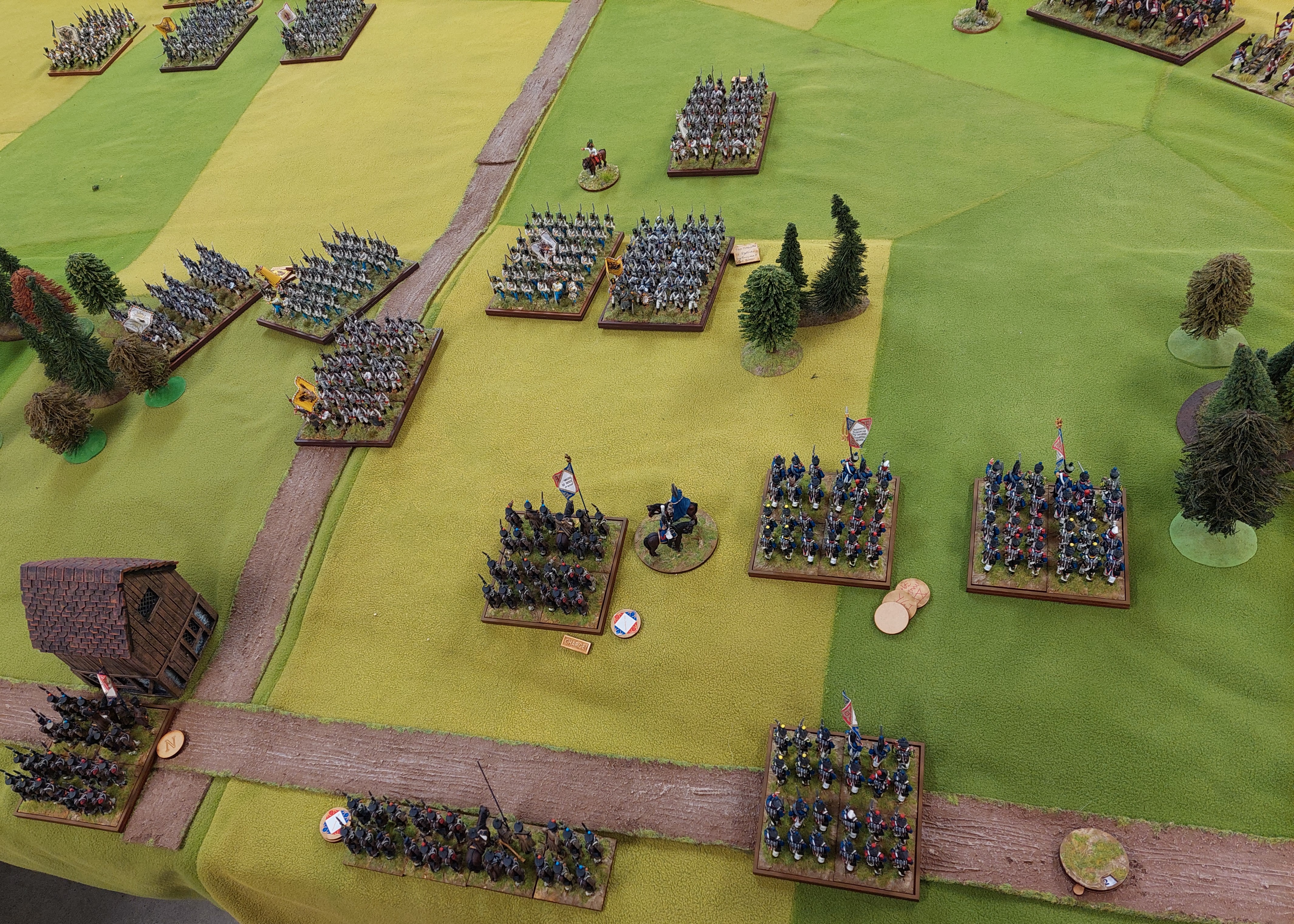 So that was that……the Austrians failed to break through and stop Davout’s march Northwards. The early loss of the Grenz and Jagers in the right woods followed by the loss of the 3 batteries in the centre really put the breaks on the Austrian attack. I rolled to see if the Austrian reserves were 5 more large bttns in the centre or the 4 Grenadiers and a 12pdr from the right corner marching on…happy was Grenadiers. But in the end, the French were to good in the centre.