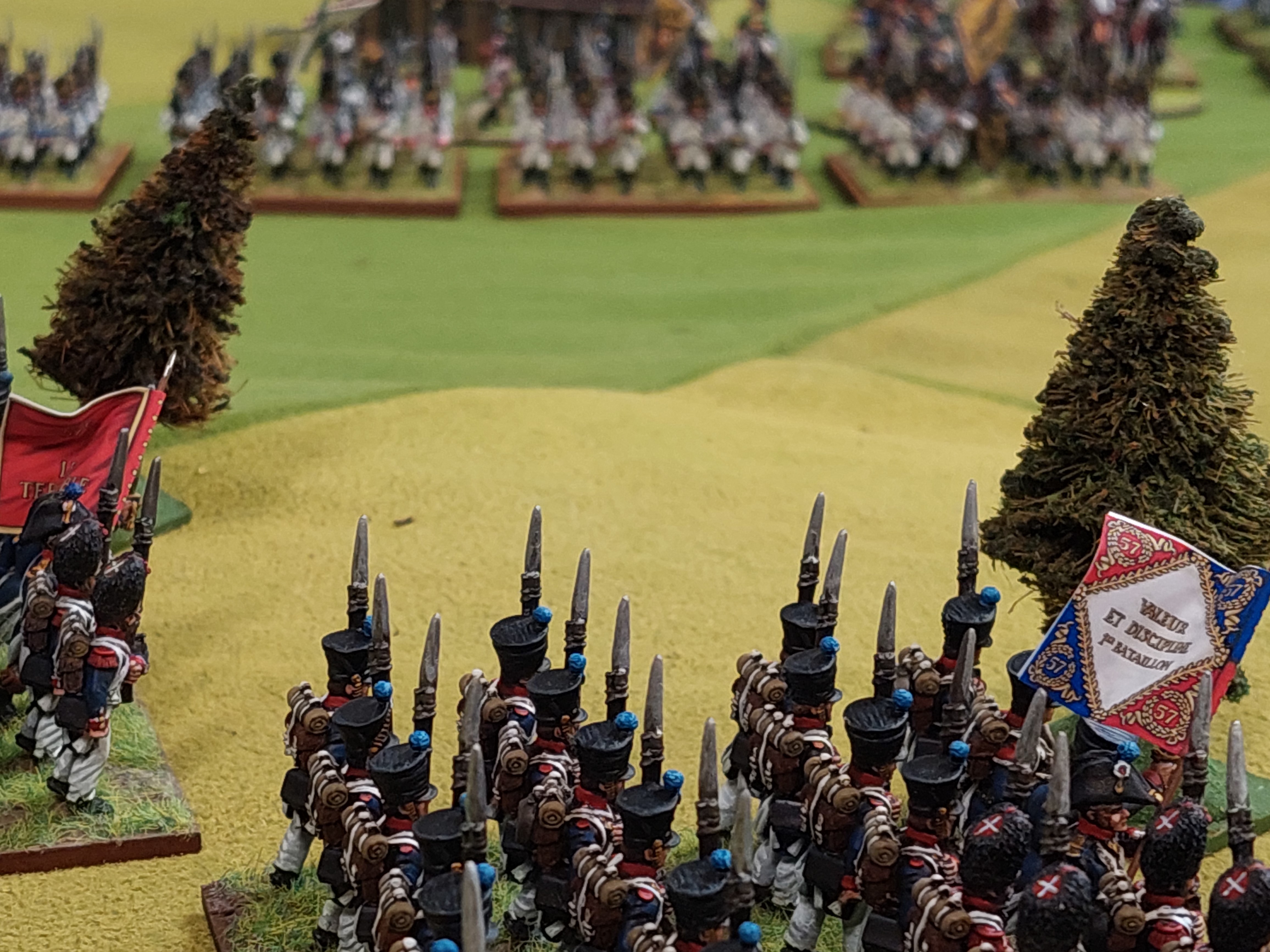 Below is the opening set up. I allocated sides to players as they arrived. Alan arrived first so he deployed his Austrians including the new units on the ridge to sweep the French aside and take Teugn. StephenC arrived next so he got to be the French defending Teugn. StevenT was next so he got to be the Austrian artillery batteries massed in front of Hausen and the 5 bttns marching onto the table. Goldie was next so he got his 6 French bttns lined up on road heading north. These French bttns are the very same bttns that were on that road in 1809….incuding..groan..the 57th. Robert arrived next so he was 3 French bttns and a battery marching on from behind Teugn.