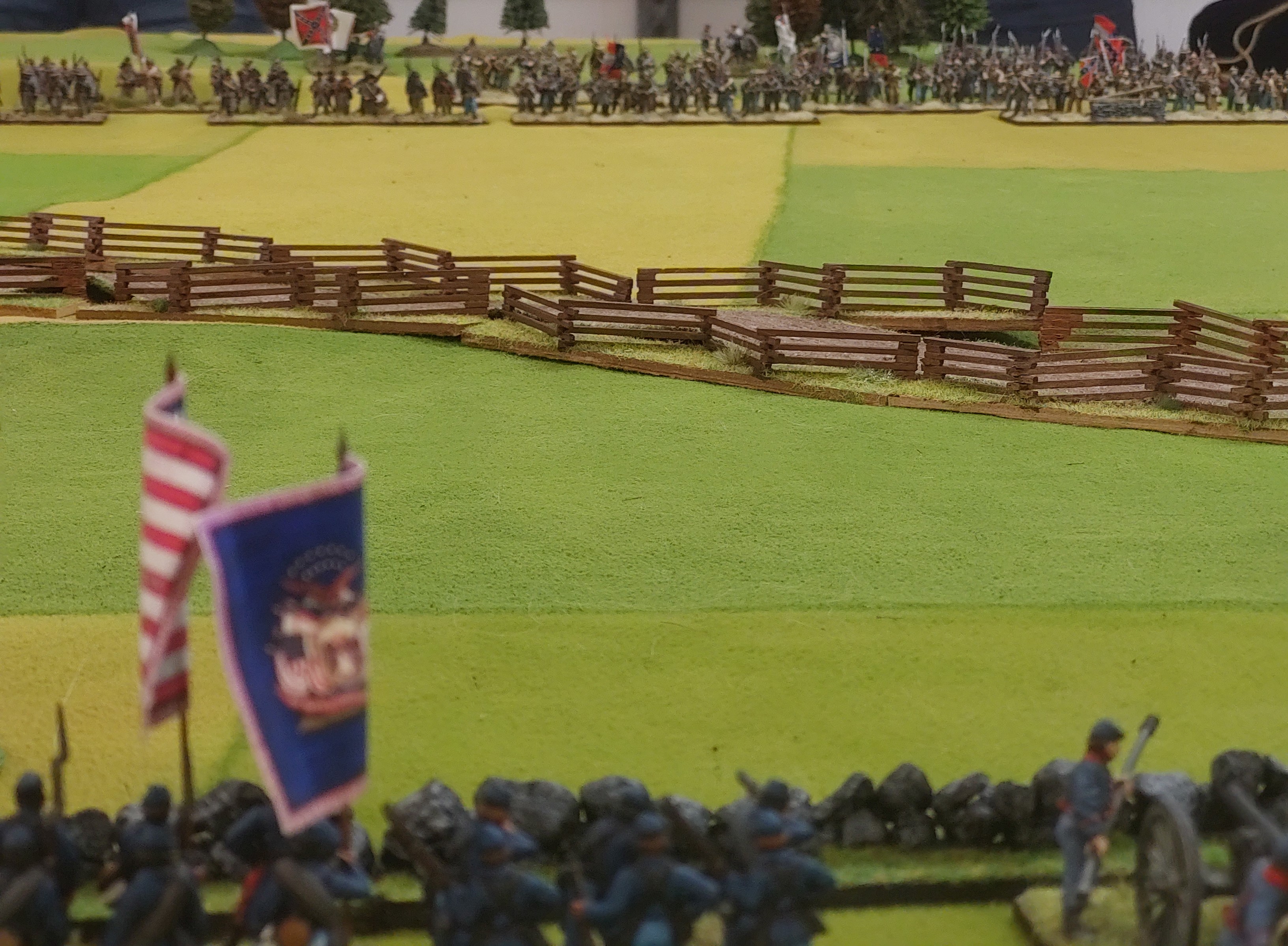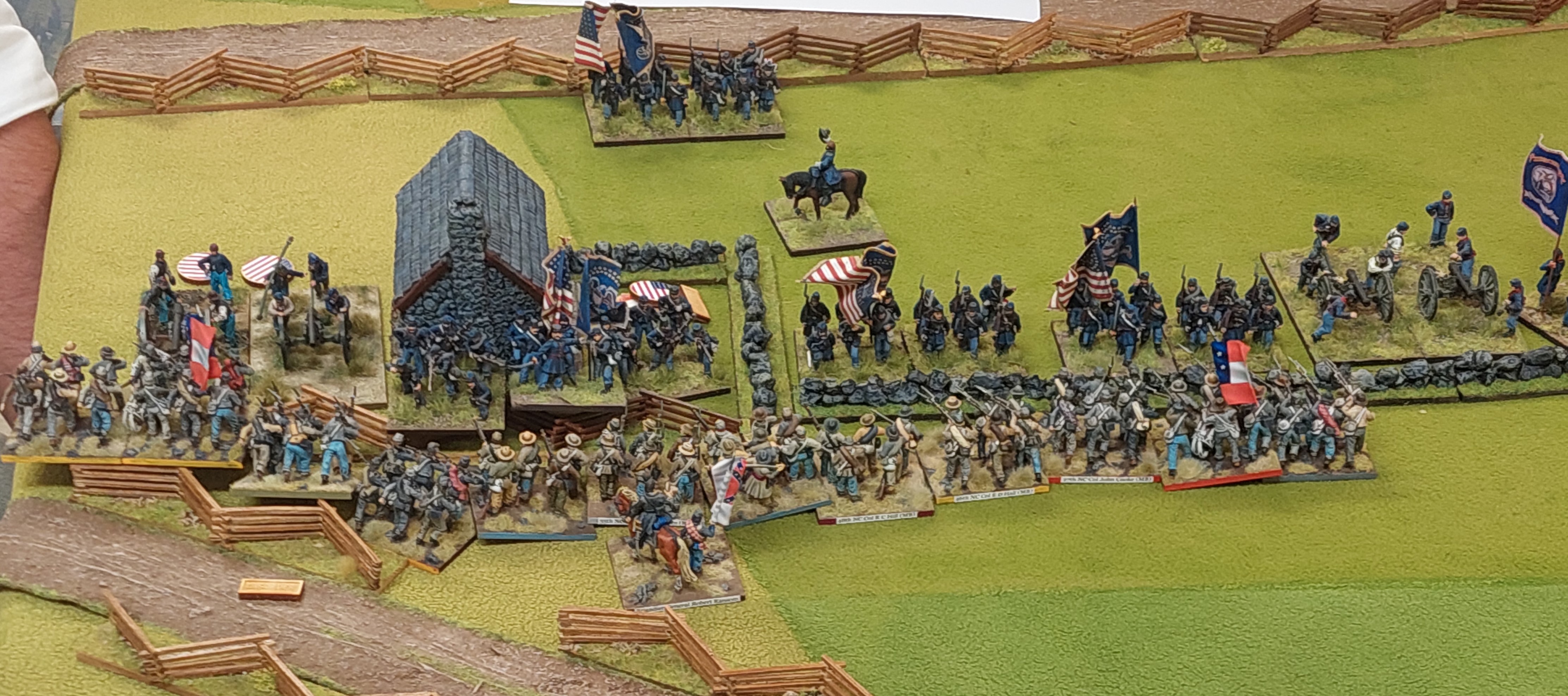 On the other flank…the game is done…the casualty and disorder markers have been removed…..but this is the high water moment….the Rebs made it to the wall…but they had suffered to much damage getting there and the Union 2nd line reinforcements plus all that artillery firepower saved the day.
