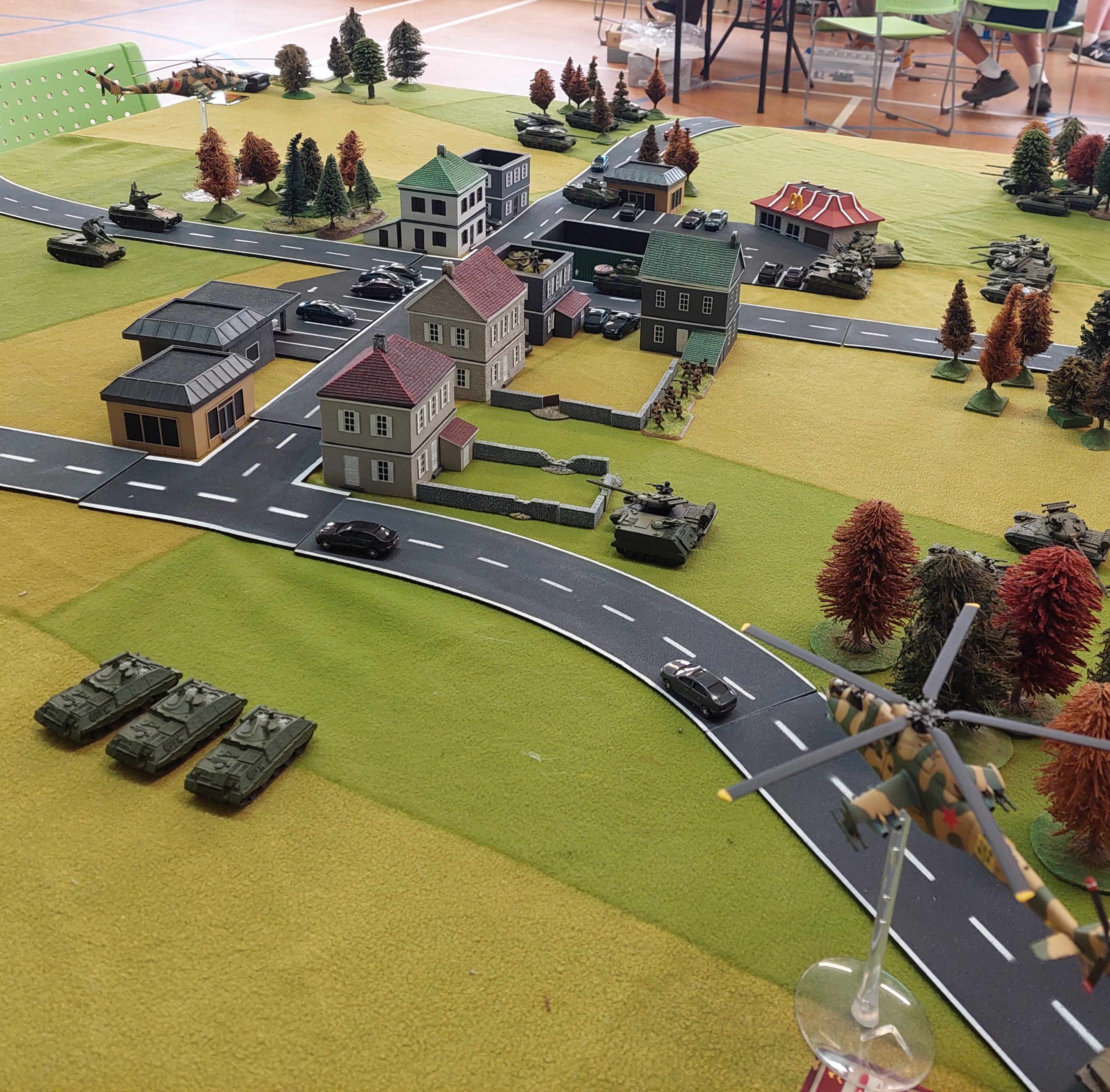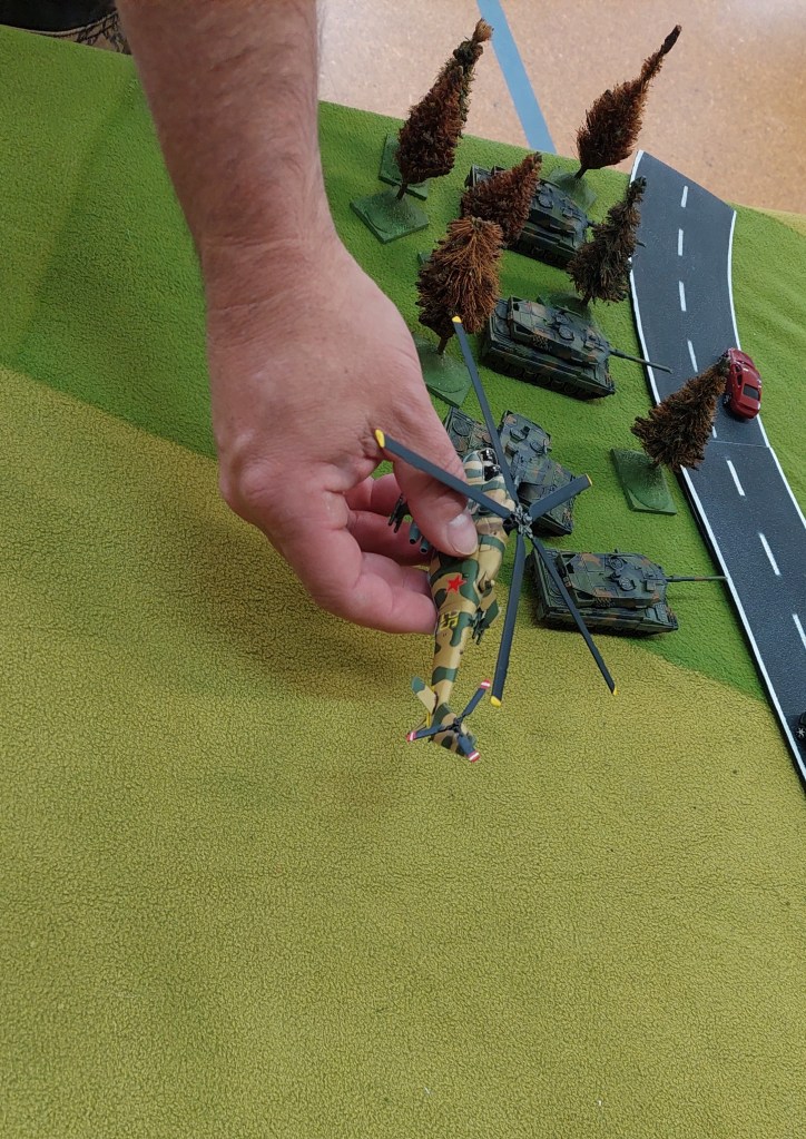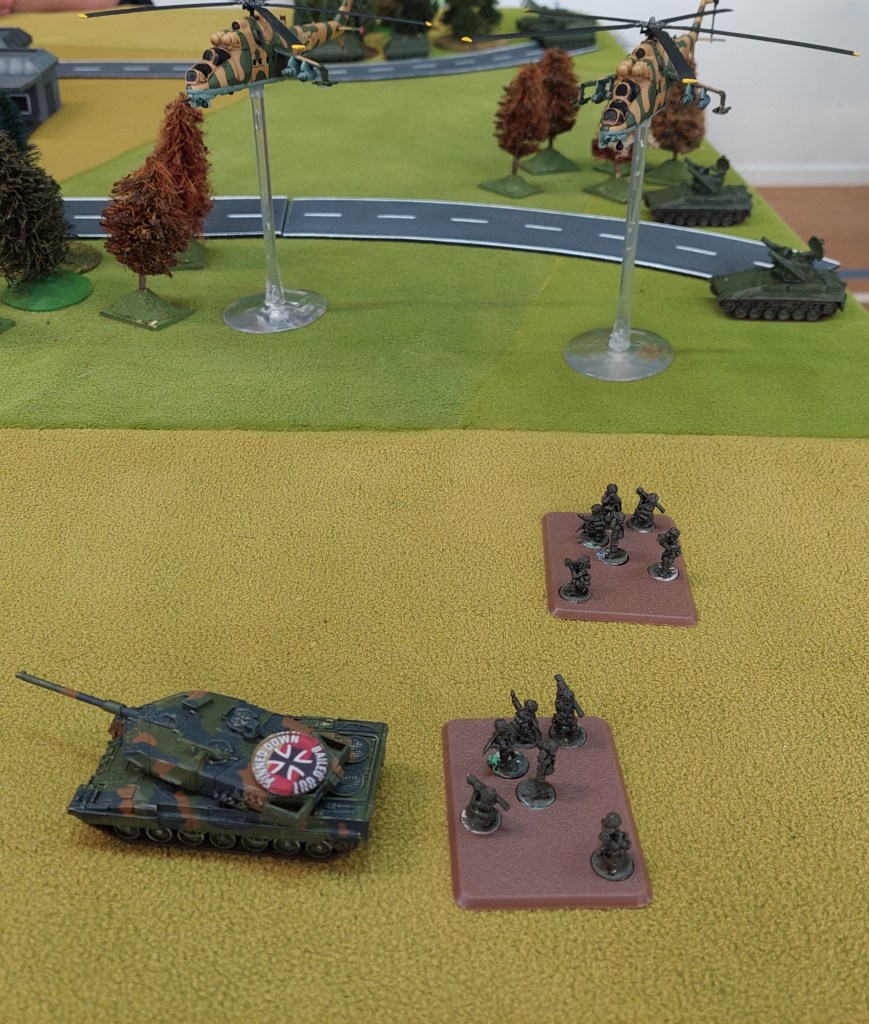 So my army had in it a units of 5 Leopard 2s, 3 Marder 2s, Panzergrenadiers, Jaguar 1s, M109Gs, Rolands and some red eye teams. Goldie had 3 units T64s, infantry, Hinds, Shilka’s and some trucks with rocket launchers.