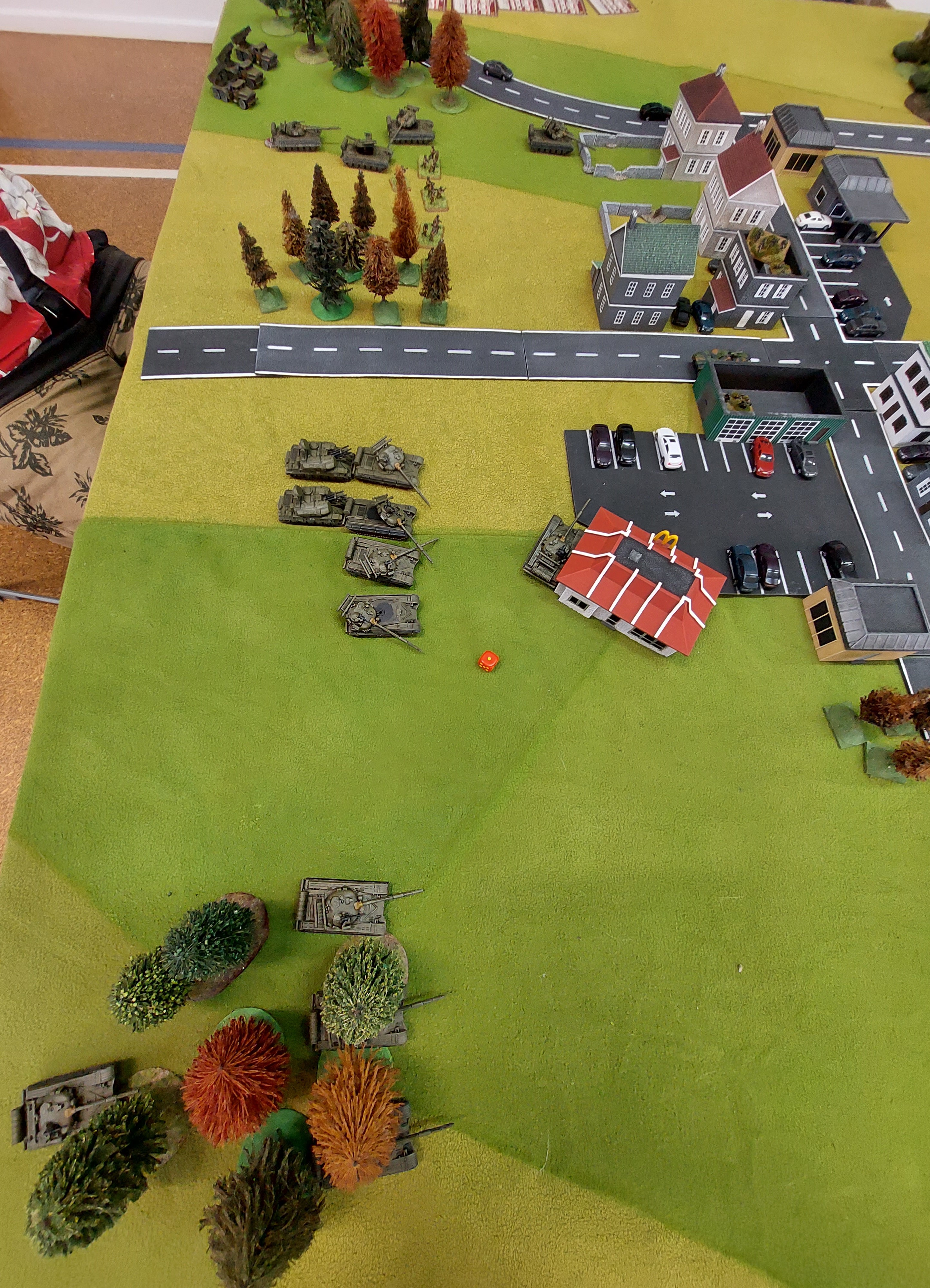 My turn…..sent my PzGrs into 3 buildings…moved the Marders up in support……..and my tanks took out 4 T64’s!! 4 more can be seen in southern wood…and command tank is ordering a Big Breakfast from Macca’s!