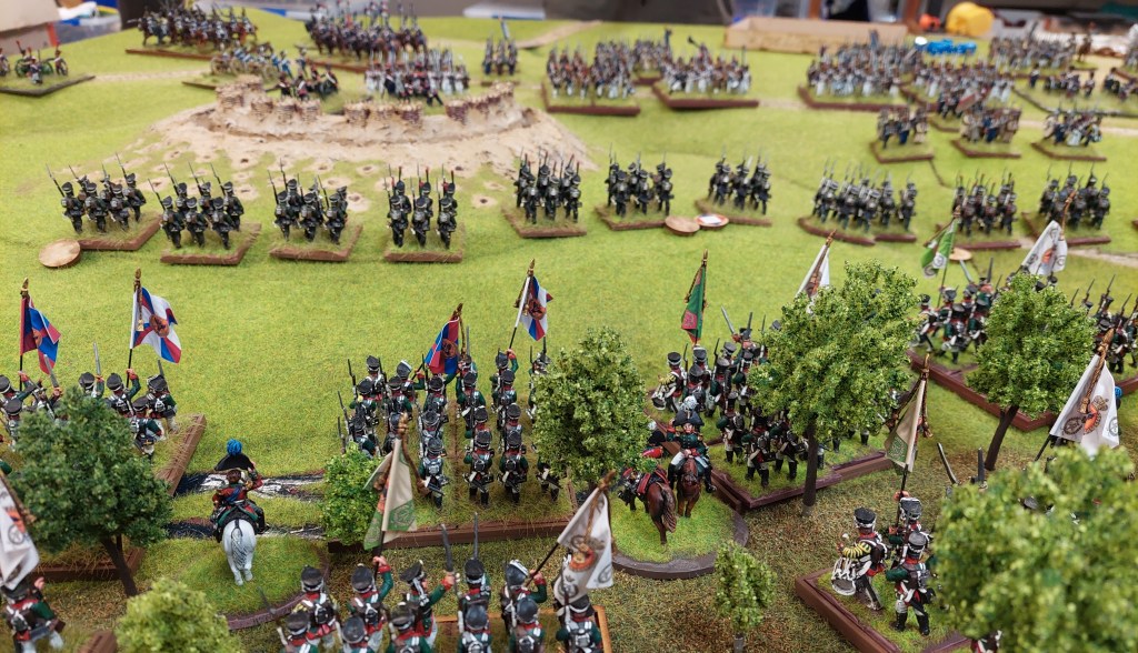 The Russians had 2 standard infantry divisions each of a 4 bttn Jager brigade and 2 x 4 bttn’s Musketeer brigades plus 2 large batteries. They had a light cavalry regt on the left and on the right a 2 regt light brigade and a 2 regt Dragoon brigade. I also gave them a 2 regt brigade of Uhlan’s in the centre. They also had a horse battery.