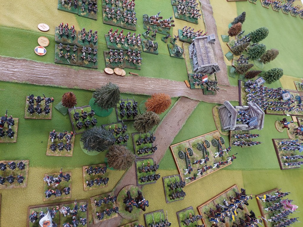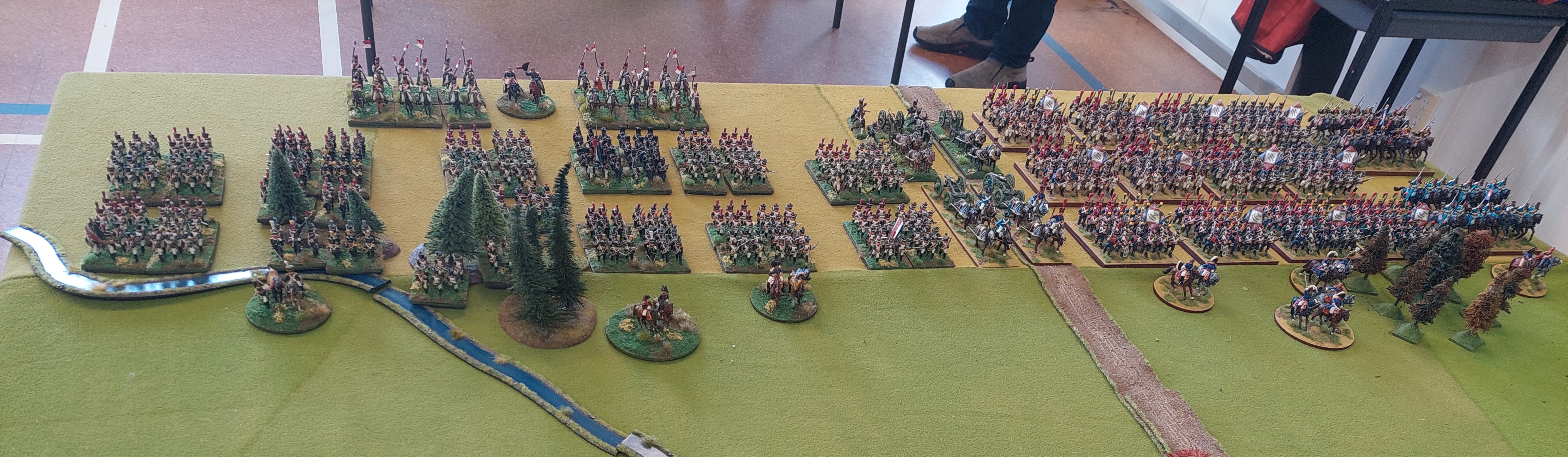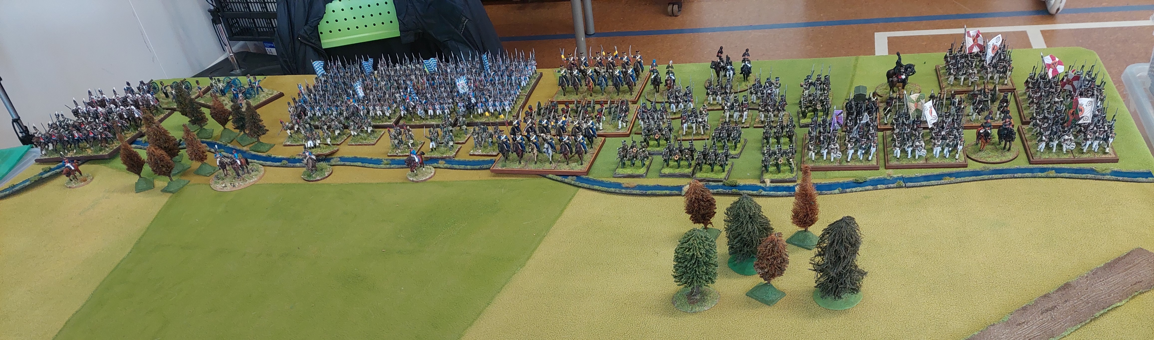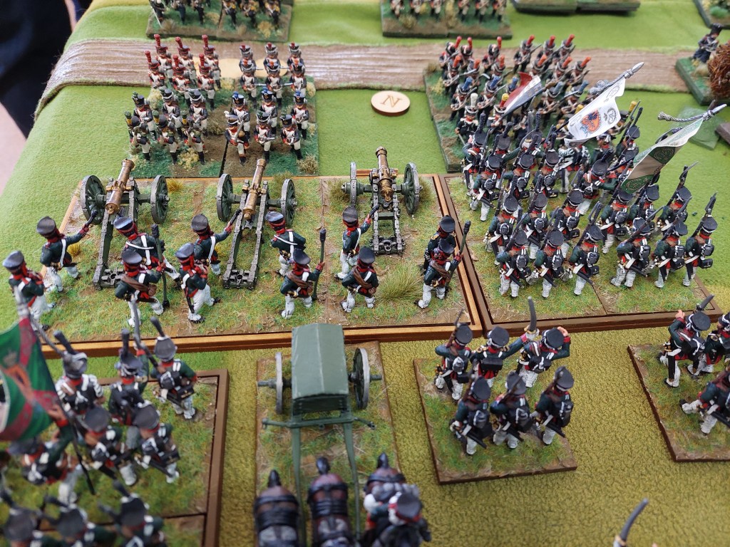 Below we have Bavarians and Russians at one end. Alan had bought along his newly painted Victrix Bavarians. Being not allowed into his office for a couple of years due to earthquake damage and the plague that goes on and on and… has really allowed Al to focus on painting armies…darn that man!