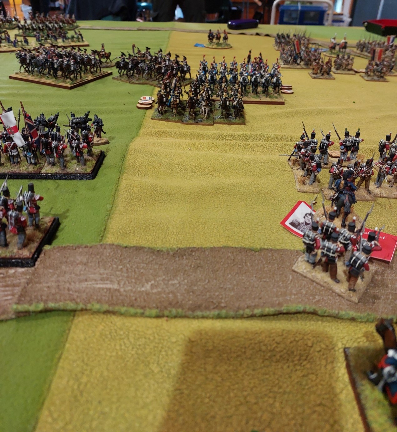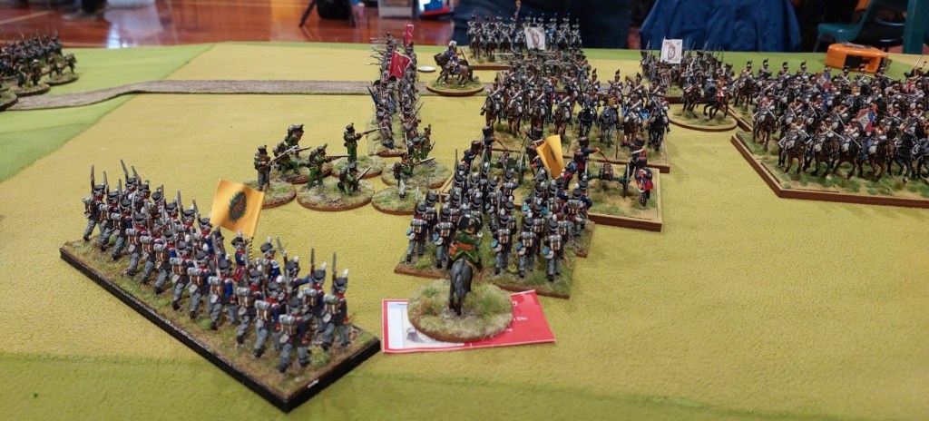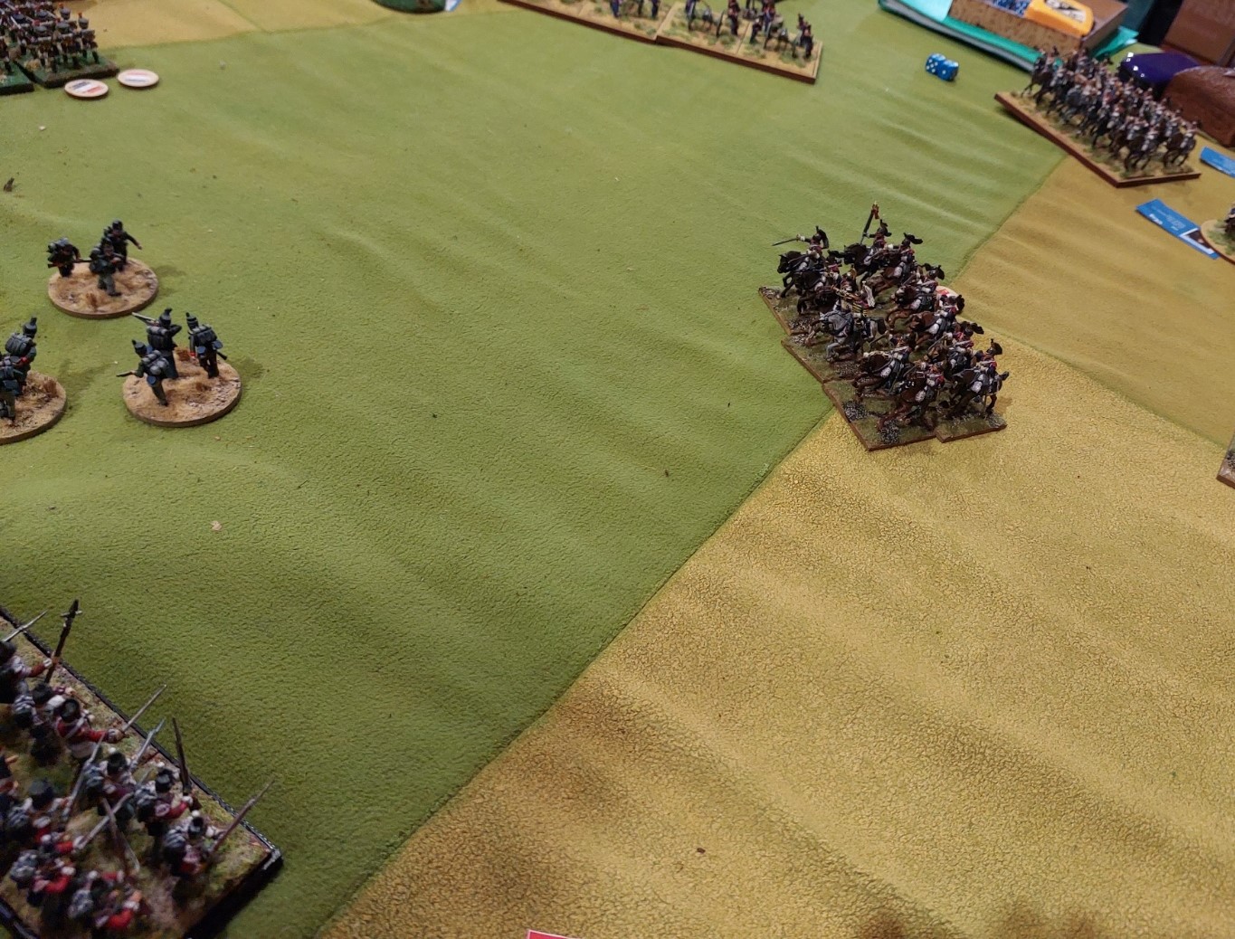 we arrived at the 4 French heavies sitting in the middle of the table…with no supports..and the 2 right side regts both shaken… so cannot counter charge and being shaken…are at a serious disadvantage……