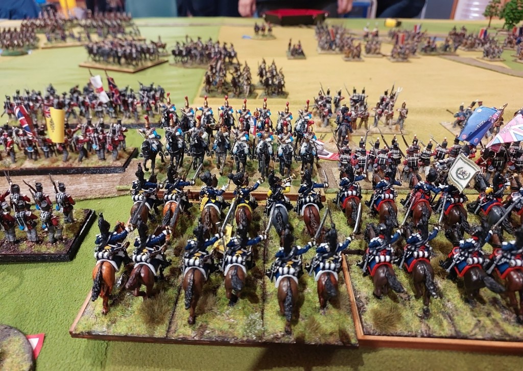 Lordy…look at this fight! 2 Prussian brigades have made it onto the table….Young Guard have made a rapid march and are attempting to hold the flank. Allied light cavalry are fighting it out with French Cuirassiers and light cavalry……and Alan has even had a rush of blood and sent light cavalry into a battery! British Cavalry have the ‘Ferocious Charge’ so that in their 1st round of any combat they reroll any misses. So where standard light cavalry are normally at a disadvantage against heavy cavalry…the British lights almost get an even playing field.