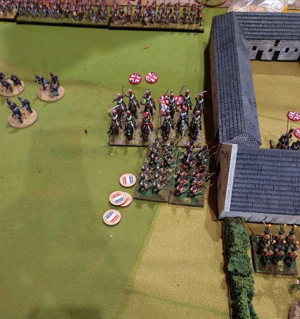 Now this is where I got so excited I never took any photos……I charged British nutter cavalry into the flank of the shaken Dragoons(they had been lurking all day behind Hougomont waiting for a flank charge opportunity…sadly the second unit with Prince William leading them failed to charge!)…who turned to face as hit in the flank…I then sent the Belgian Carabiniers (my Favourite Front Rank Models) into the now exposed flank..with Tripp leading them….in the resulting melee…the French Dragoons popped…the British Cavalry sweep off into the flank of a Cuirassier unit…while the Belgians hit the shaken Cuirassiers…..at the end of it all…the French Heavy Cavalry were no more…and the Allied cavalry retired out of danger.