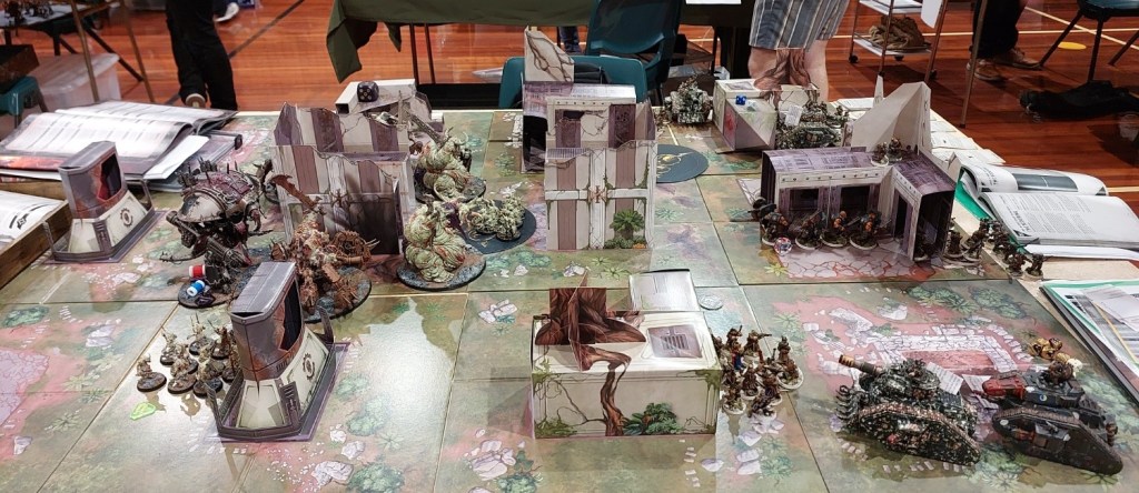 First up some pictures of the other games in the hall to start the report. It’s a great venue, the ‘Expressions Arts and Entertainment Centre ‘ in Upper Hutt that has a large well-lit hall, a fantastic cafe on the other side of the door from where our gaming table was plus ample parking. For after gaming festivities its a mere 200metres to ‘Brewtown’ which hosts a number of Craft Breweries, Eateries and a Distillery! SO A PERFECT VENUE.