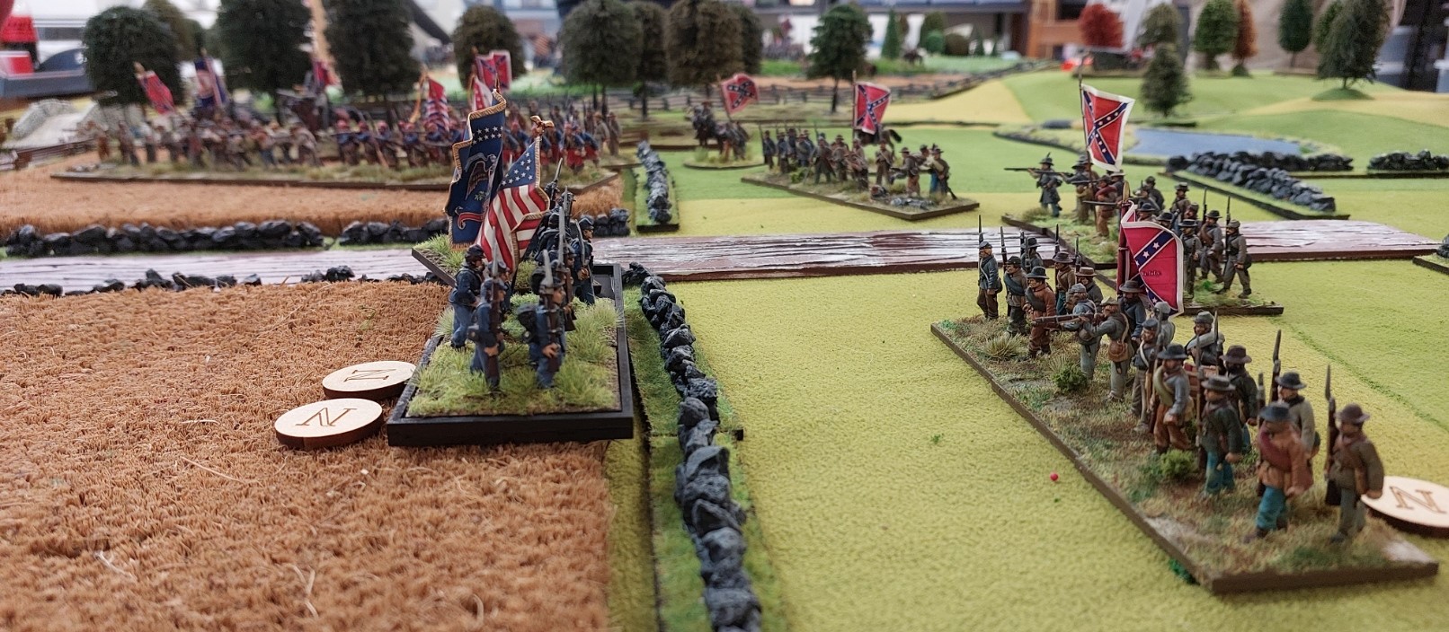 Keith has the encamped Union brigade while Goldie has the Union brigade marching away. Stephen has the Confederate brigade closest to Keith while Graeme’s Confederate brigade is closer to Goldie.