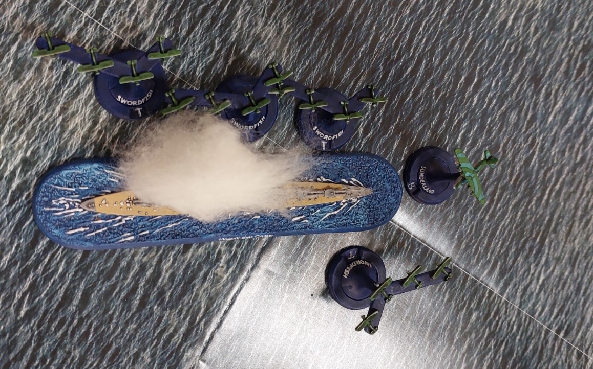 Last turn of game……Japanese planes attack the Nelson…..Sea Hurricanes and Fulmars attempt to stop them. Smoke is the flanking cruiser.