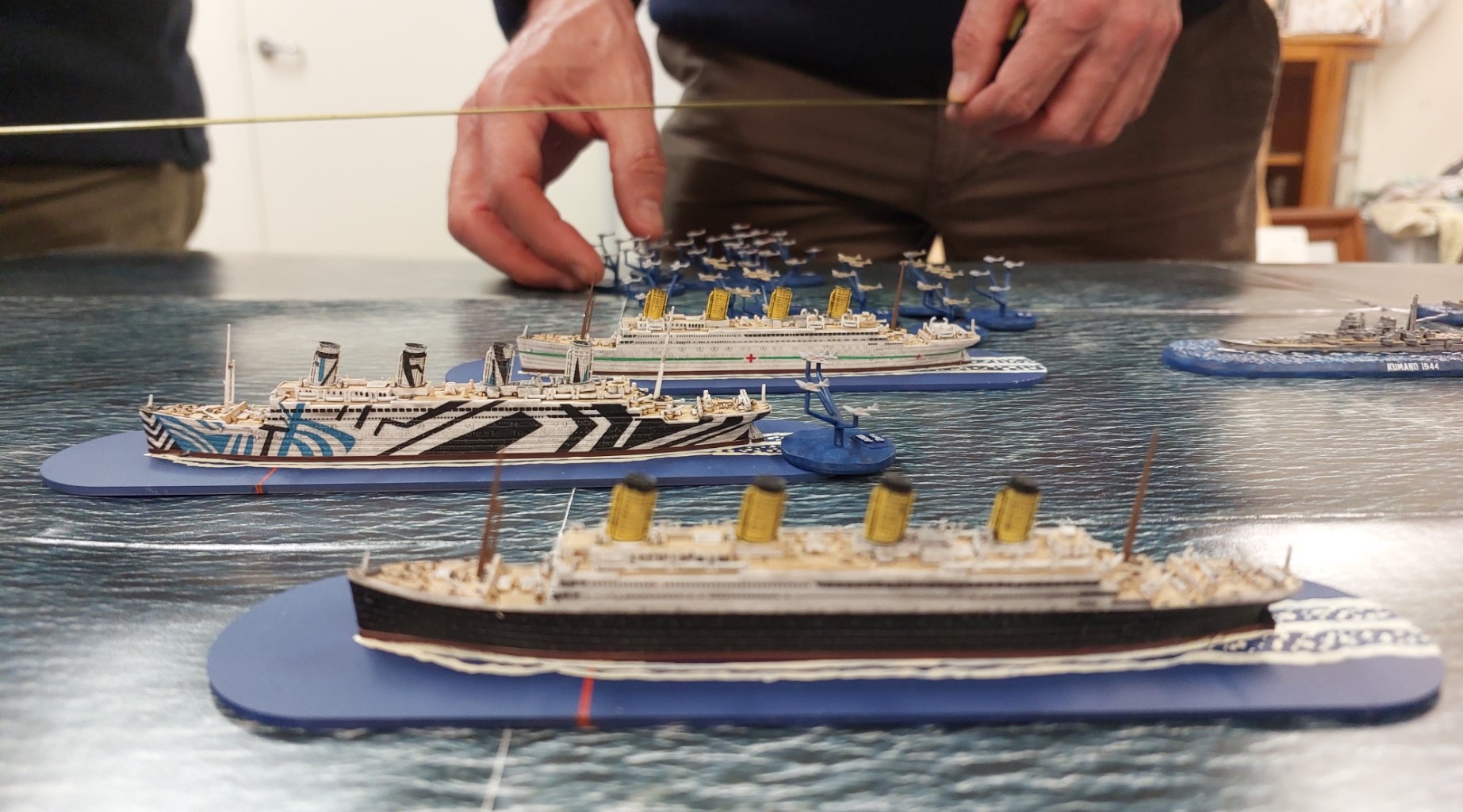 Now with Russ overseas that left available fleets as Stevens British and my Japanese. A quick paint of a carrier and its 18 flights and my Japanese were ready. Russ even returned in time for the game and bought along a Japanese Carrier and Battleship plus 3 clip together prepainted Japanese kits of the Titanic and her sister ships!(he also bless his soul bought the 3 for me as well!).