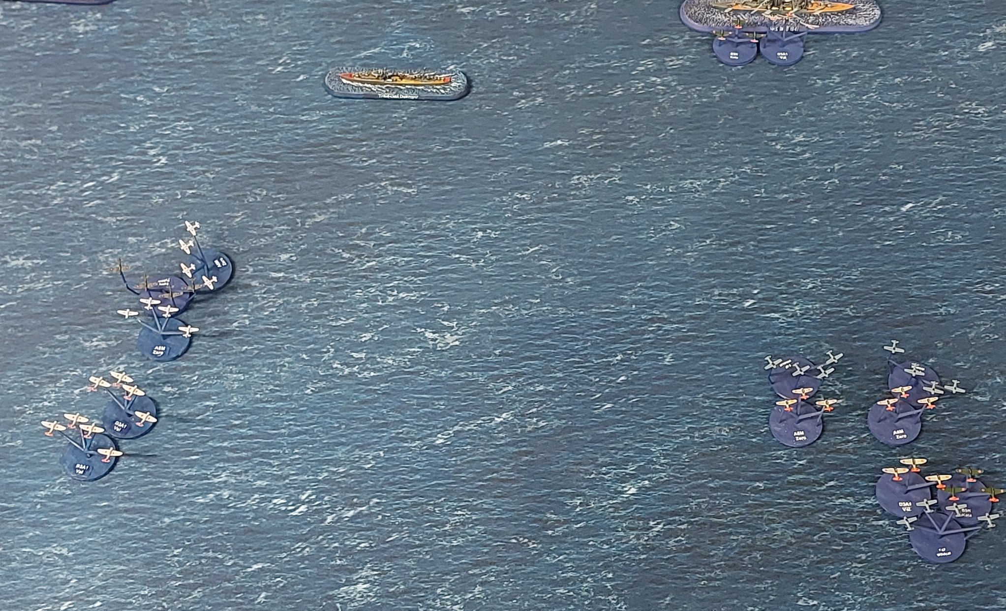 As I was Nagumo I decided at the start to scout with 6 of the Strike Bombers, which left 31 Strike aircraft and 11 Zero’s in the Strike Force and 6 Zero’s on CAP. Below is my Strike Force arriving on Allied table and being met by 3 fighter bases.