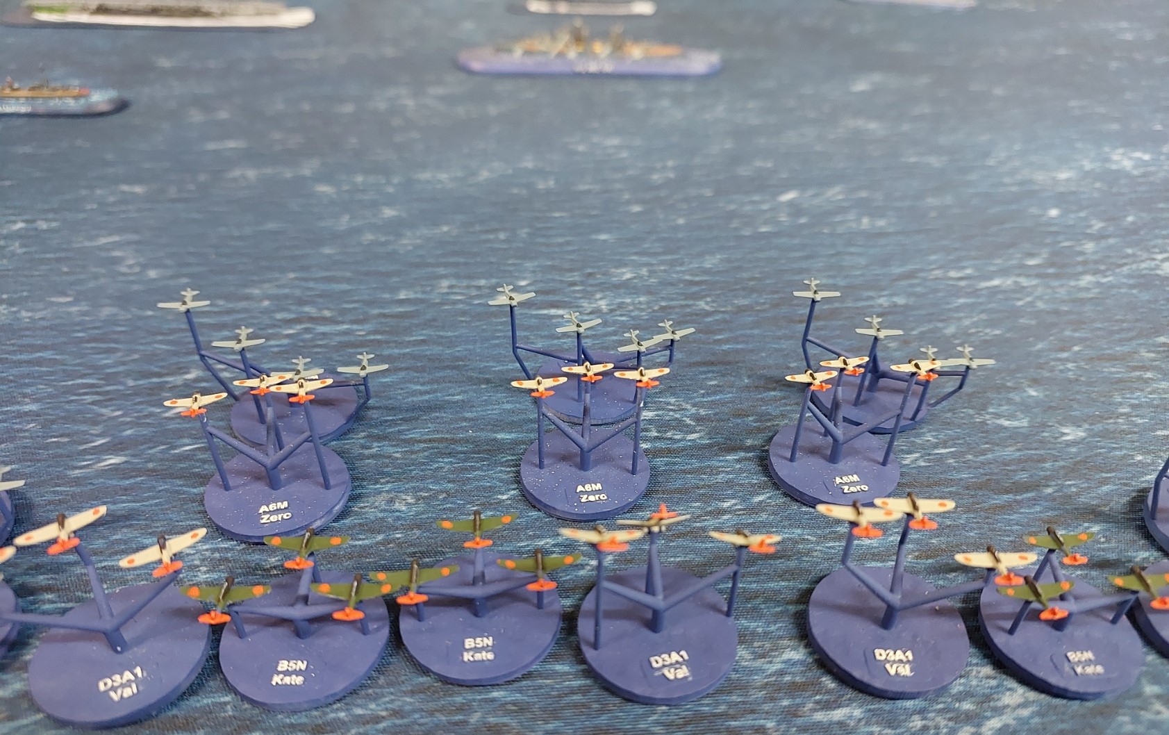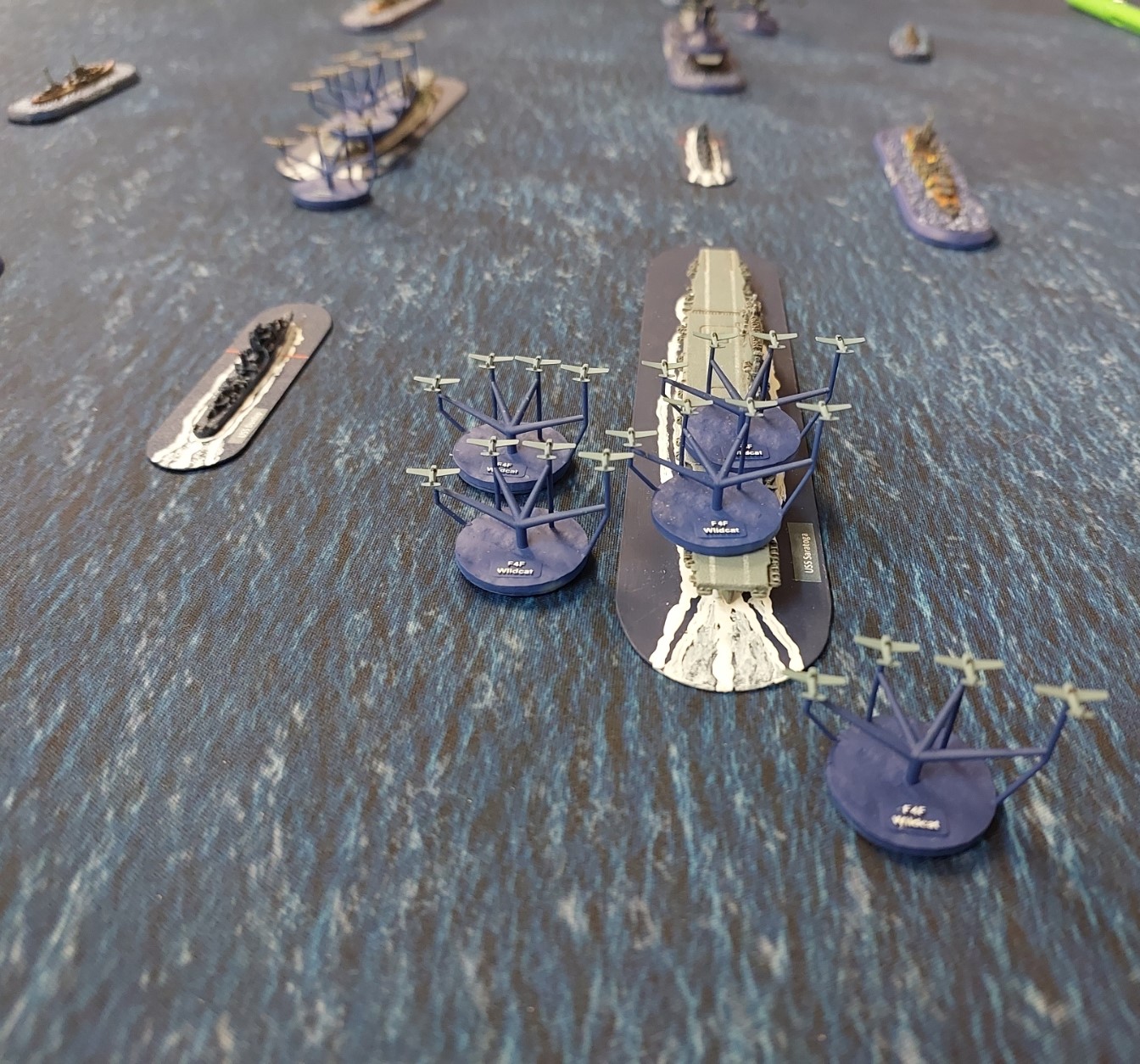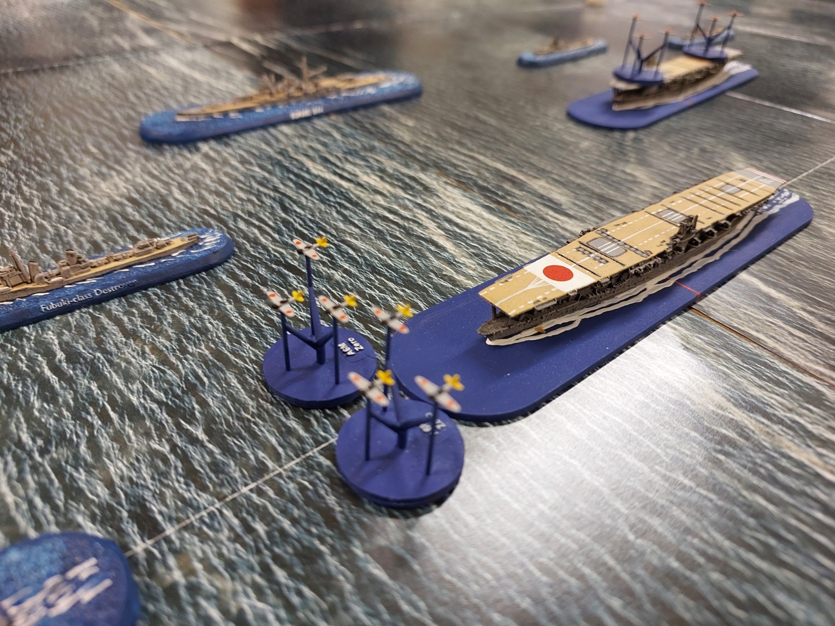 We had comprehensive instructions for Combat Air Patrols(CAPs), Scouting and pregame decisions which I will move on from. The IJN however rolled best for the scouting and we sighted the Allied Fleet first. The IJN fleet is below with our CAPs of 2 flights of fighters per carrier airborne awaiting any incoming flights!(the 2 finished carriers are Russ’s. I have just found someone who makes decals so mine will be getting an upgrade!)