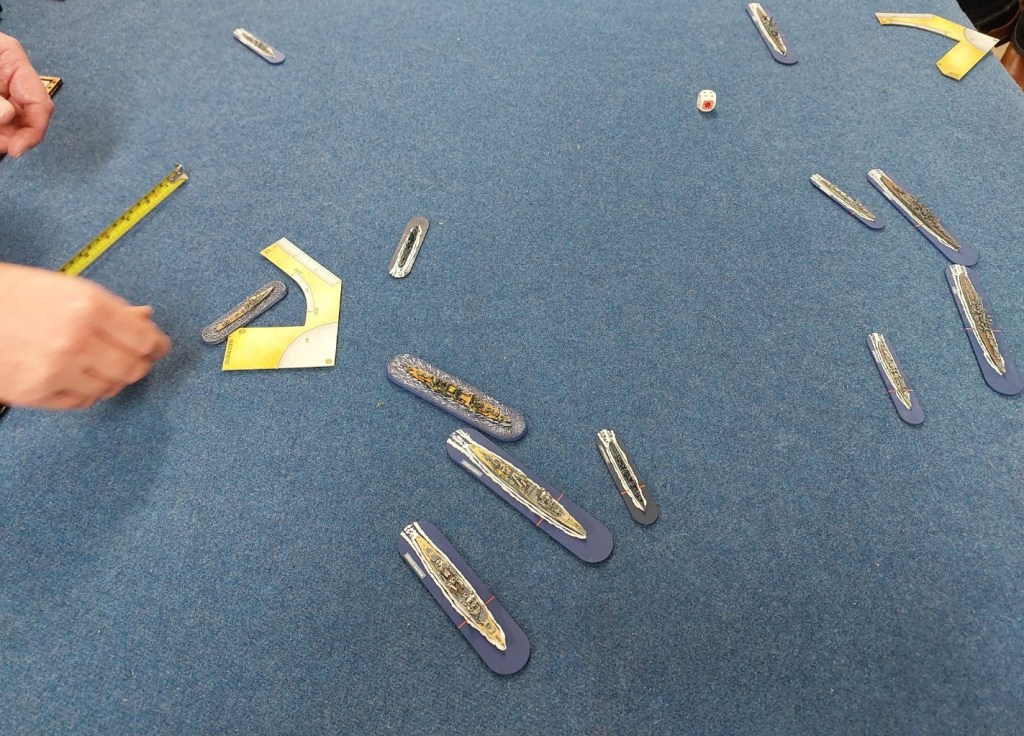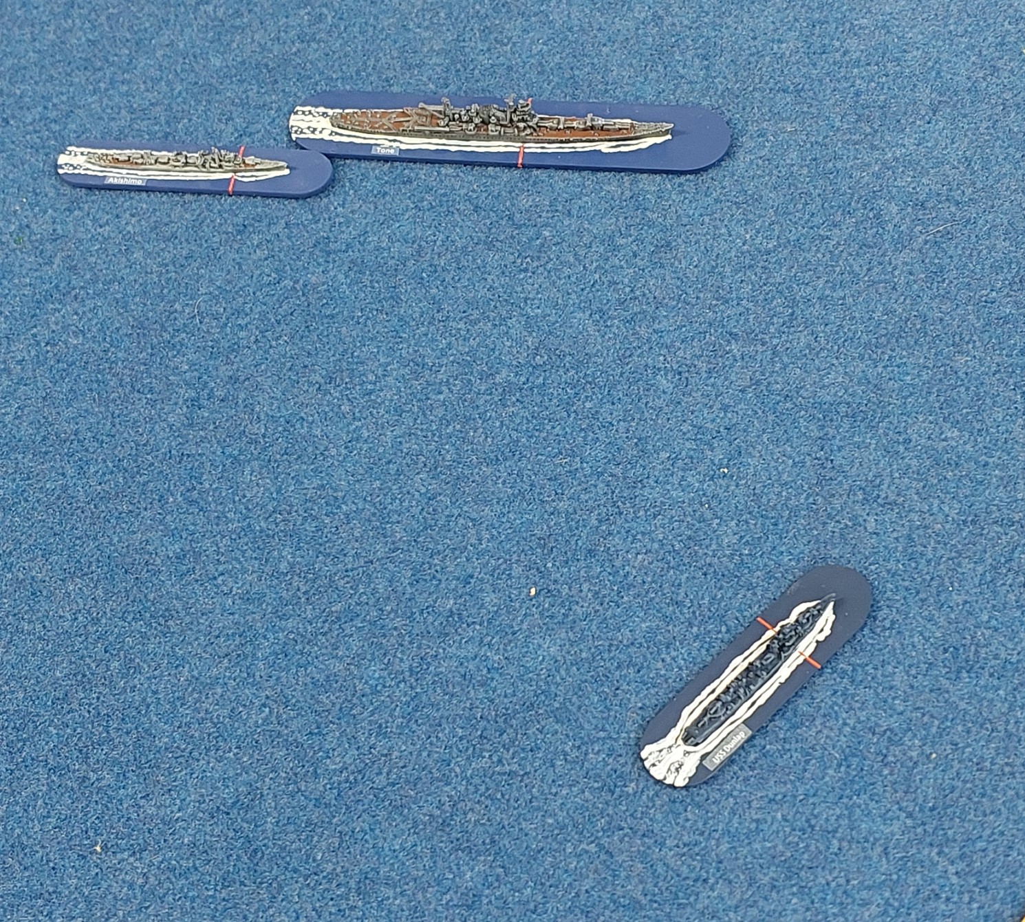 Japanese heavy cruiser and destroyer facing off to my brave destroyer trying to get in close….its torpedoes have a range of 10inches…half that of the IJN version. Next game will need to balance the quality of the IJN ships at this stage of the war better.