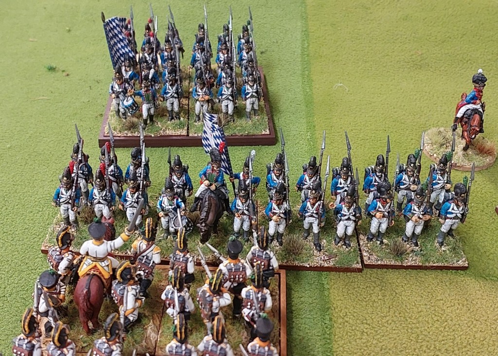In the final action…….the supporting Bavarian bttn has moved to not have an open flank…..as 2 regts of Prussian Landwher cavalry are facing it…..if they can get in…they should be able to take out the shaken unit in combat…..6 attacks into a shaken flank…hitting on 3s…minus 2 save…..and only 3 attacks back on 6s…..perhaps cause break tests…and perhaps even sweep into the flank of the Bavarian line unit…..lots of perhaps…alas…they failed the order to charge….and that was that…..