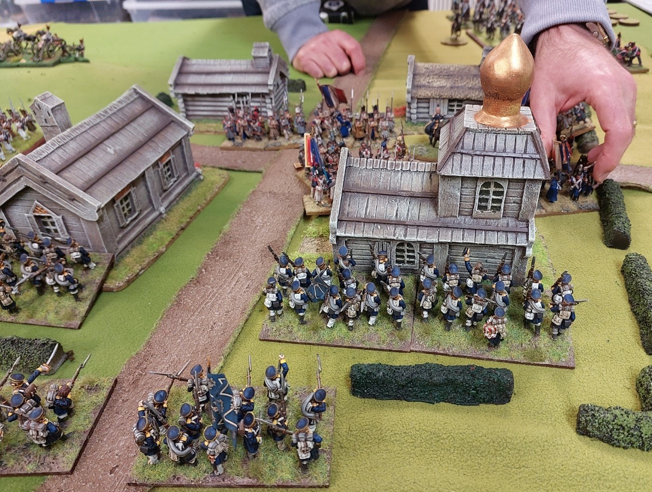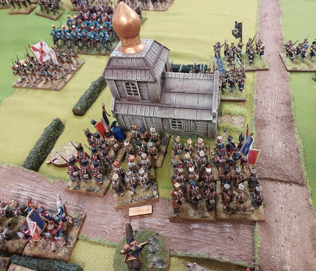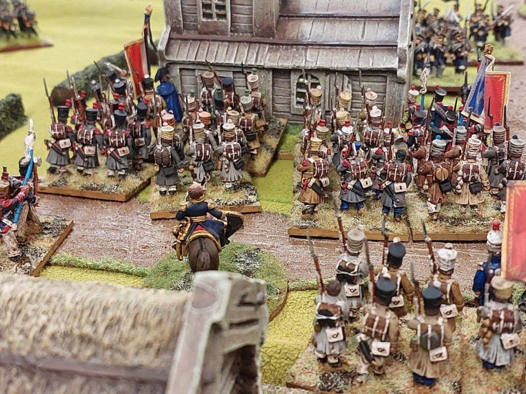Prussians occupying the village…buildings are Hovels…painted by Hovels http://www.hovelsltd.co.uk/Russian%2025/rusvil.html. It is quite hard to evict a unit in a village unless you can attack multiply sides or you have softened up the defenders with artillery fire at medium range…as Graham found out.