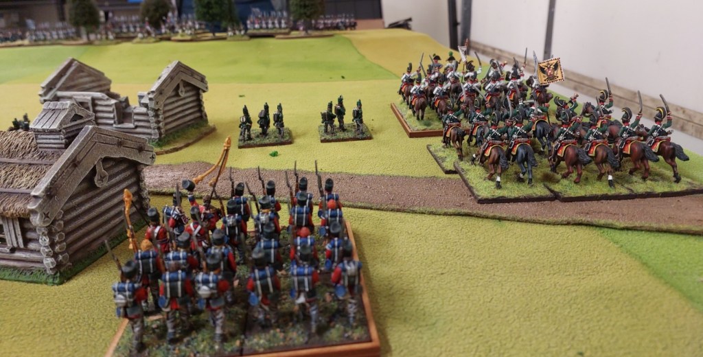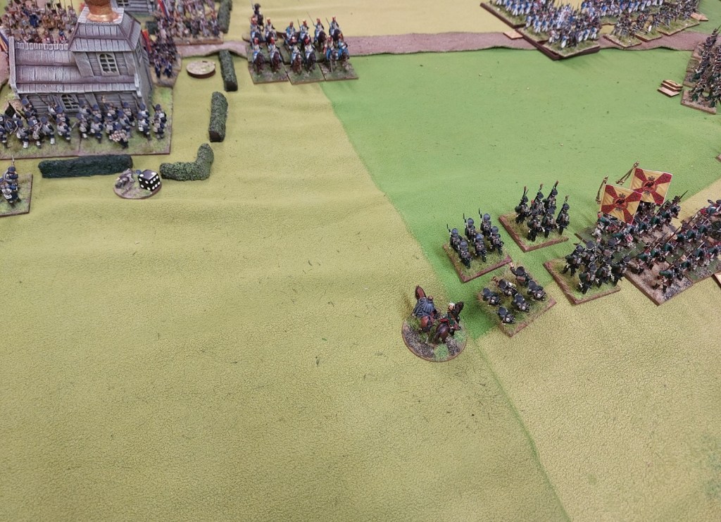 So Graham sends his Dragoons in against Russian Hussars…who have pointy sticks. I swapped a French light cavalry unit with the Dragons to even out the odds…pointy sticks inflict a -1 save in cavalry combat and -2 versus infantry. Dragoons get an additional attack and add +1 to combat resolution.