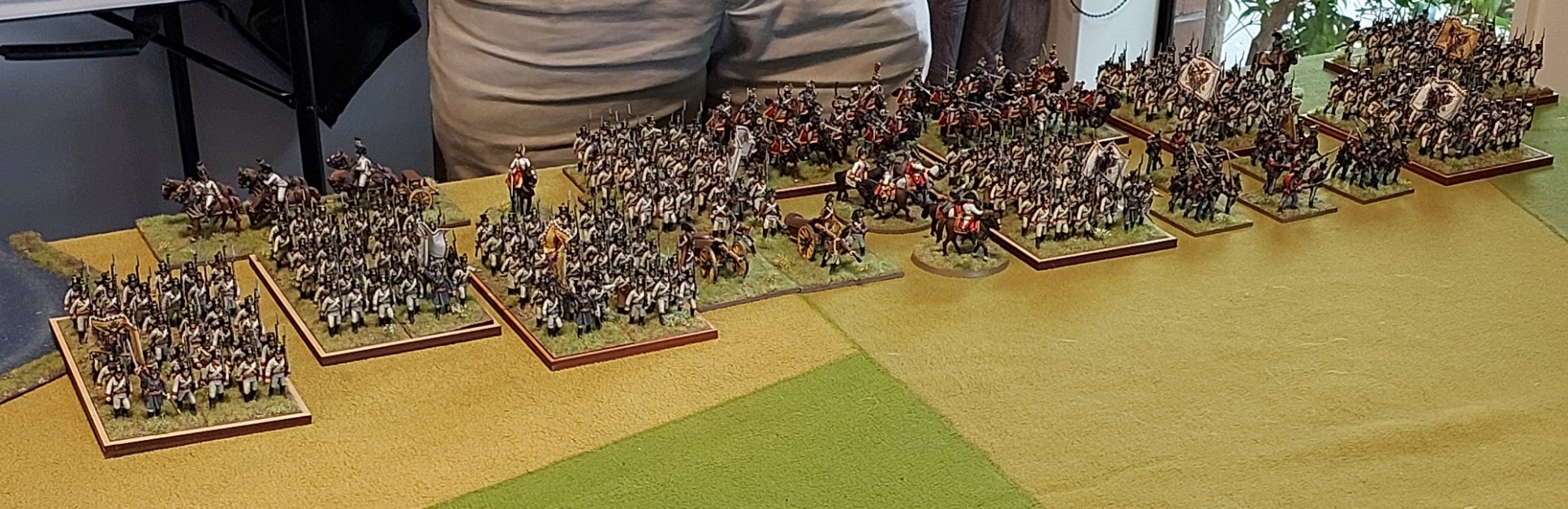 The French right flank forces are below. John came down from Auckland for the game and bought his lovely French heavy cavalry with him. Steve T. pulled out at last minute so John got be Mortier as well as Murat. Opposite him is Stephen as Gyulai.