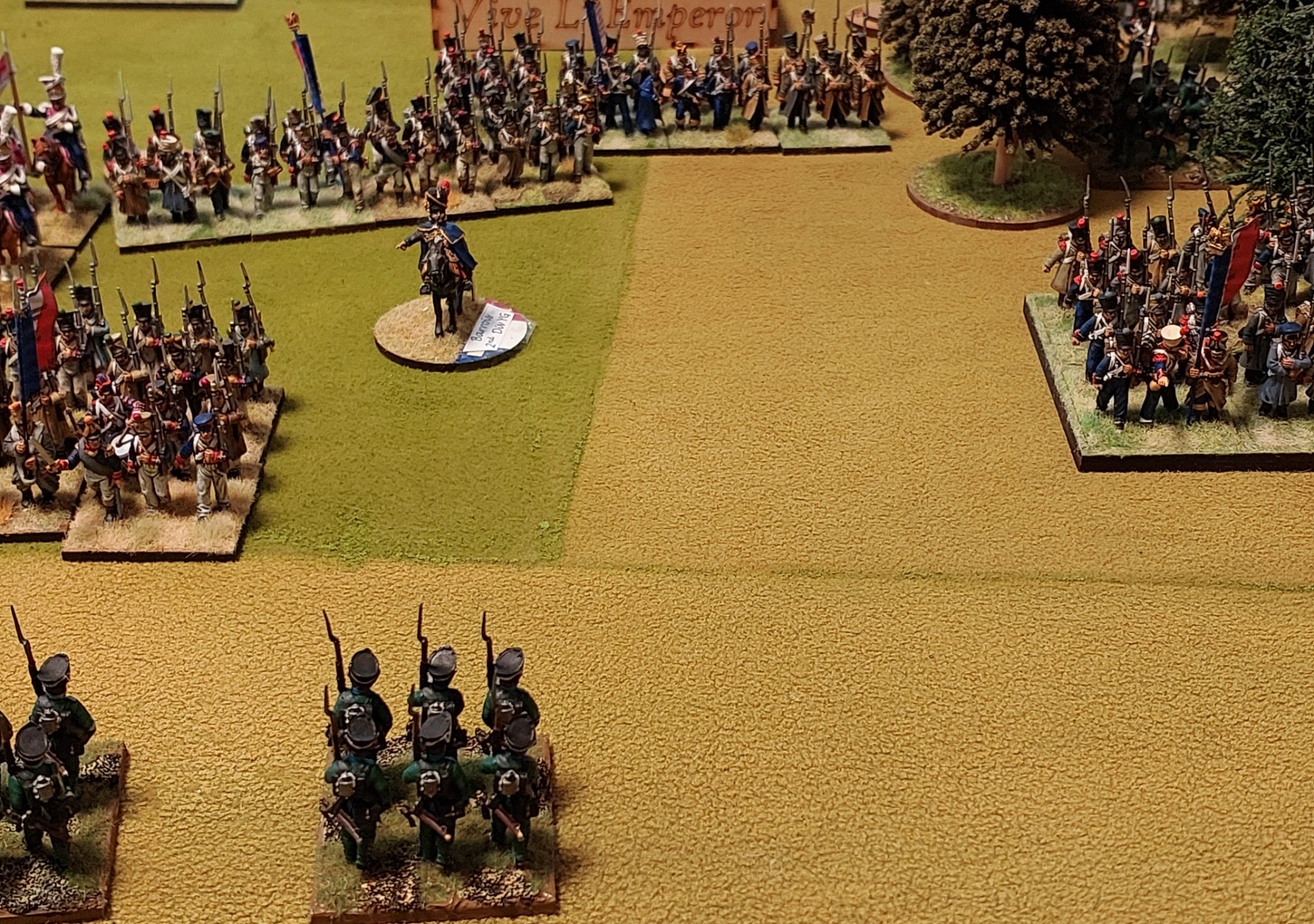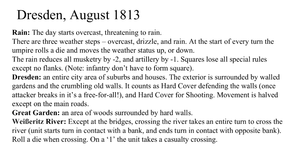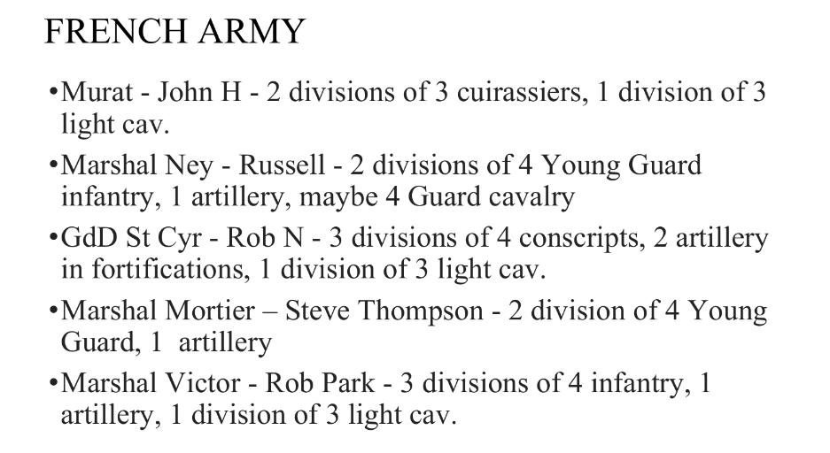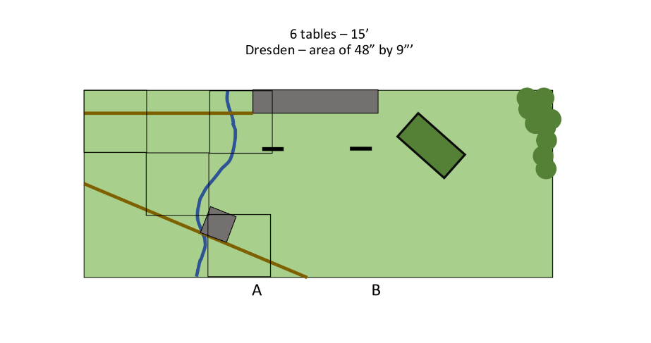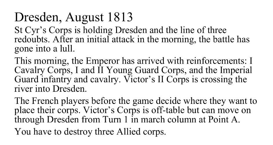 Goldie chose the game to be a Dresden 1813 refight. The set up and orbats are below.