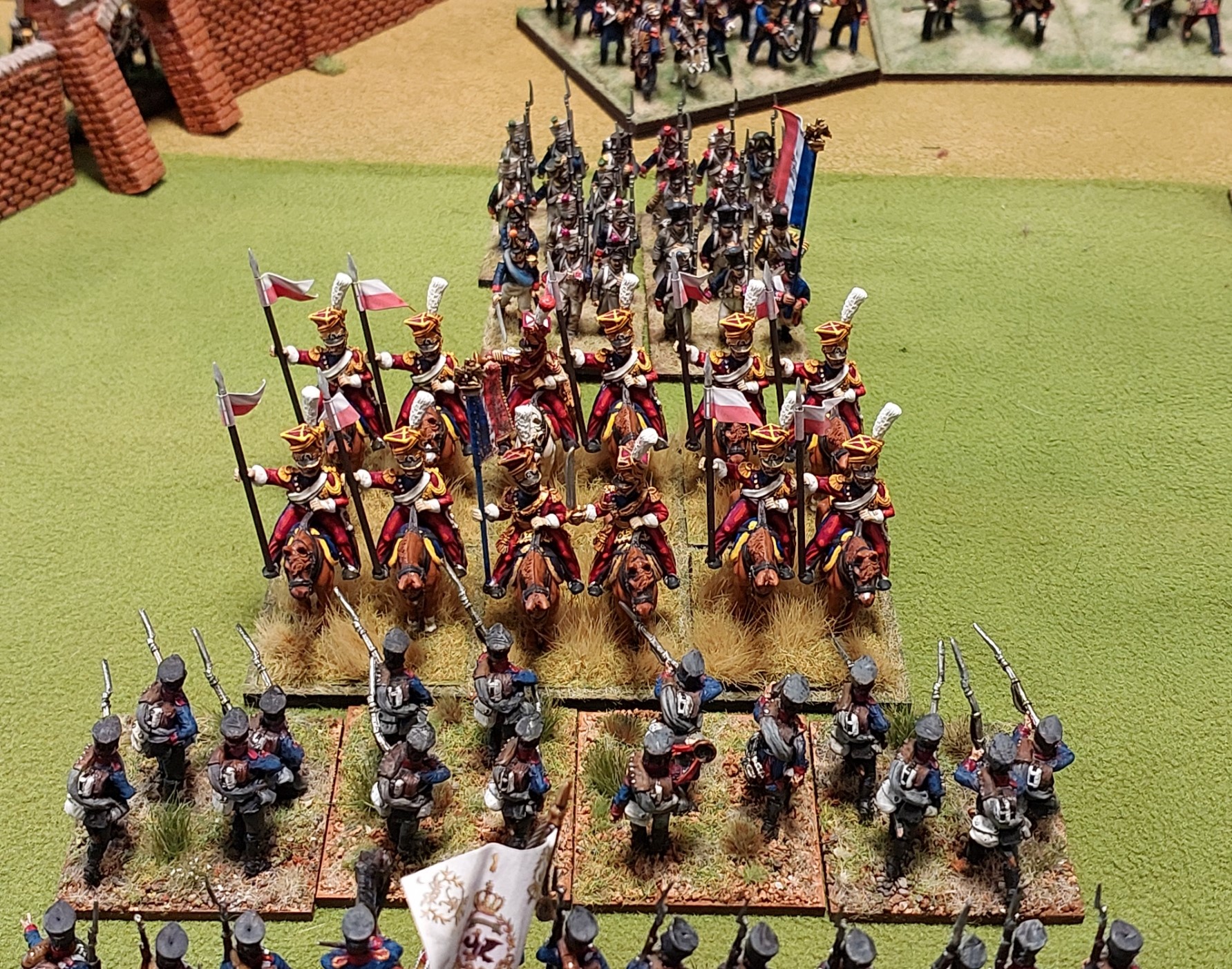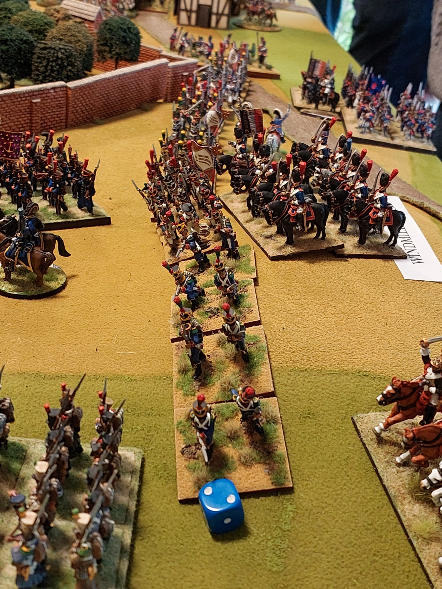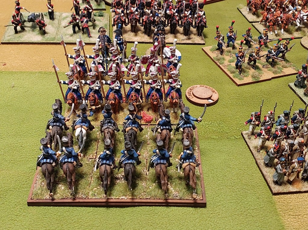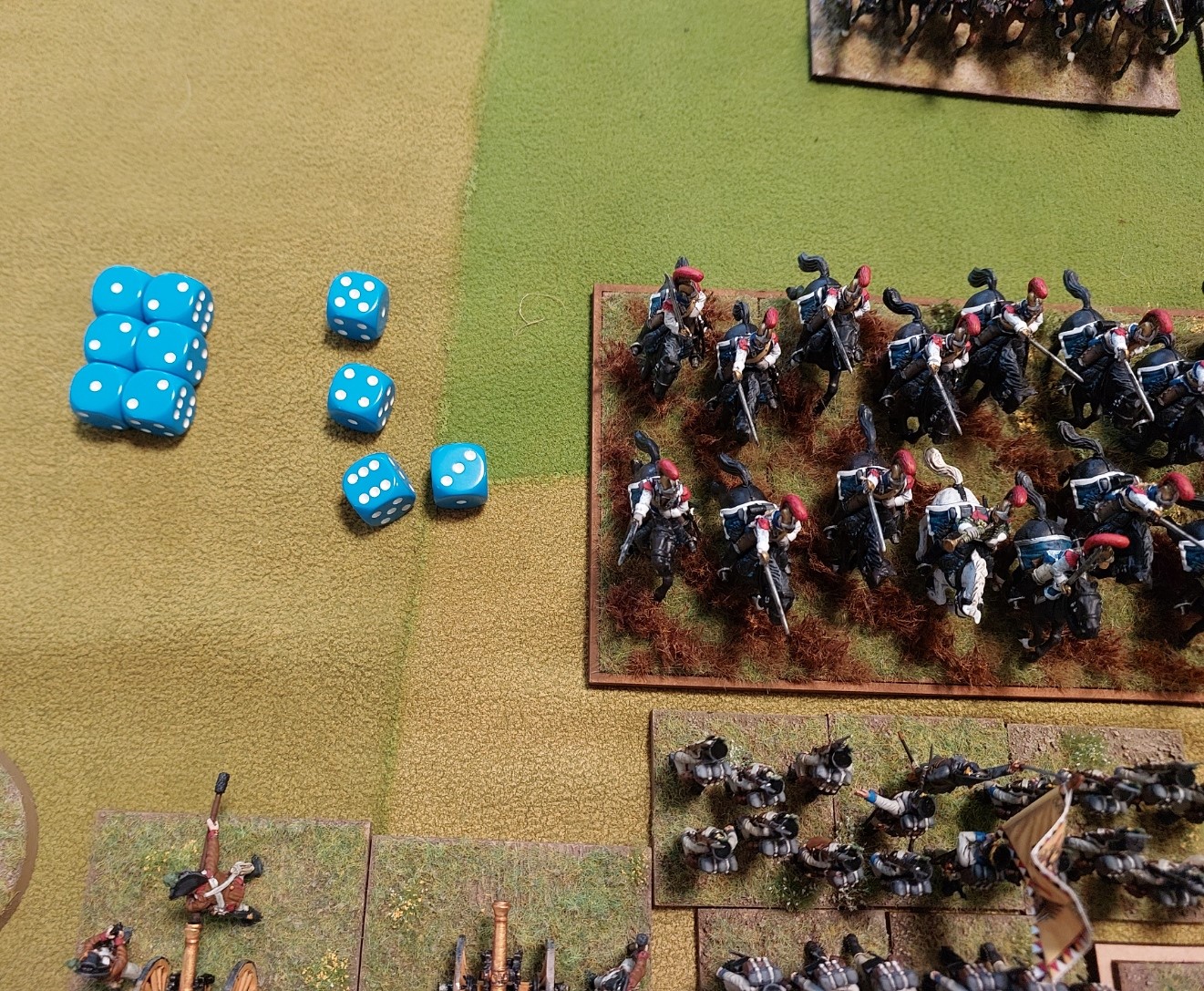 Prussian Cuirassiers take on French Guard Lancers….the Lancers are destroyed. Russ replaced his dice.