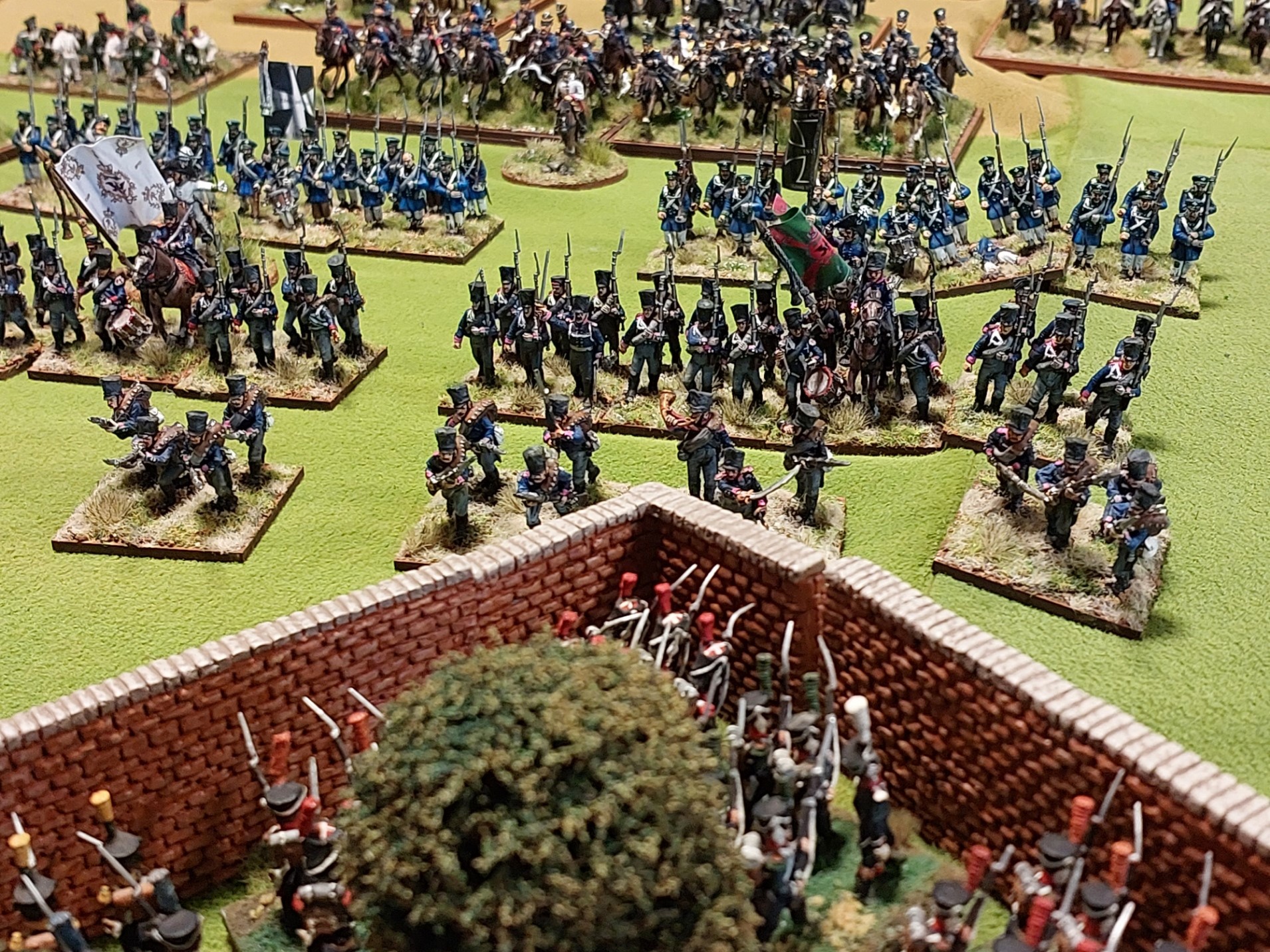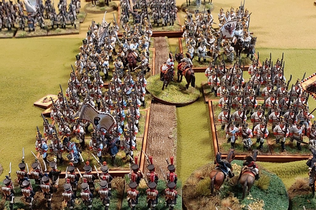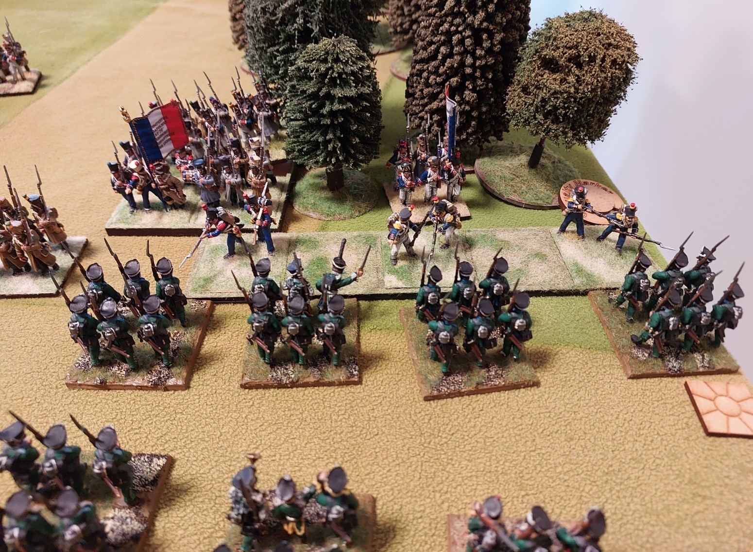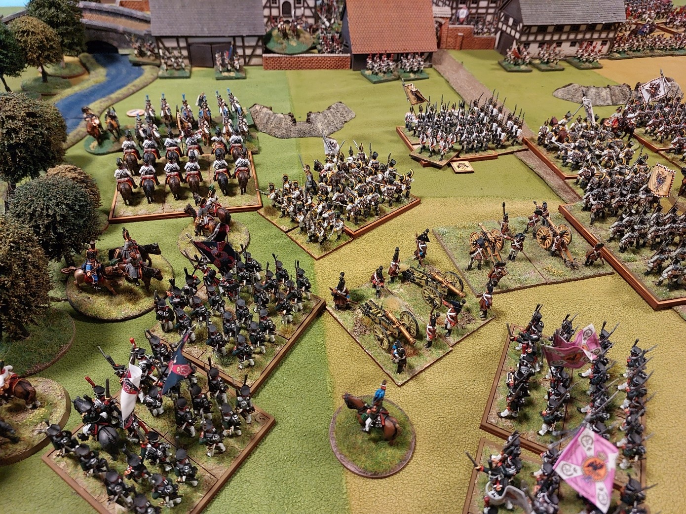 A look down the flank…..the initial French attack is repelled. I have moved Grenadiers up to line the riverbank and Graeme has moved his Grenz into the Village.