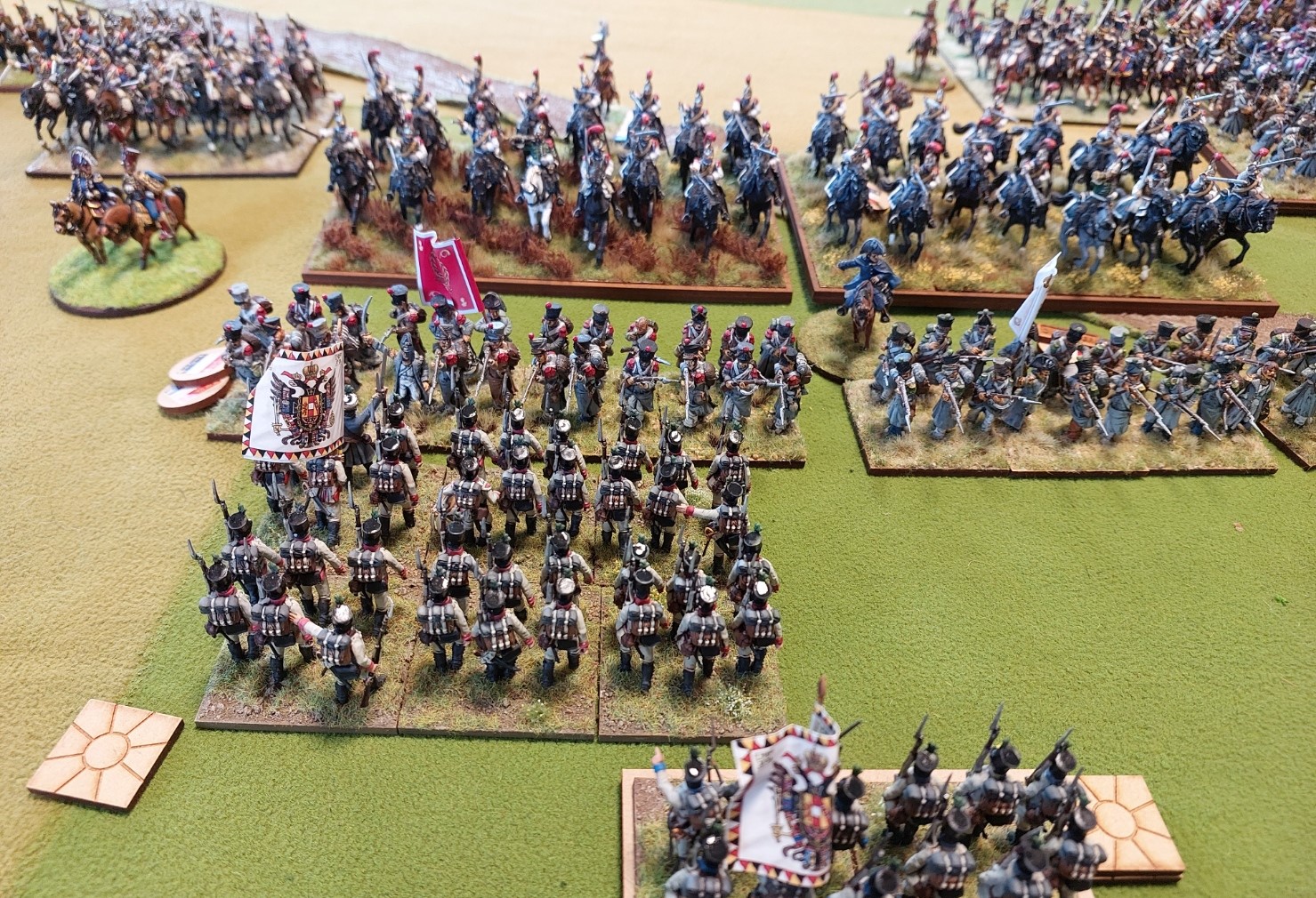 In centre PaulW who was over from Vanuatu had his reserve cavalry arrive on table…6 Russian Cuirassiers, 4 Guard infantry and 4 recalcitrant Grenadier bttns who refused for several turns to arrive. I suspect in protest at Paul leading them and not me…I am their normal commander. In front of them are Alans Prussians advancing in line…yes line…its 1813….I didn’t think Prussians knew what a line was then…..its a COLUMN Alan…a COLUMN.